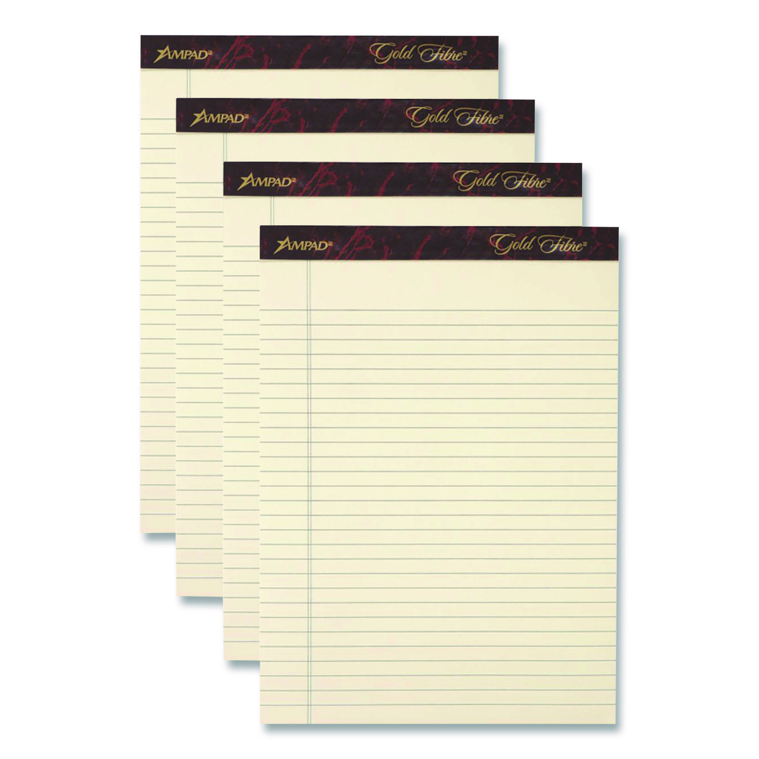 Ampad® Gold Fibre® Writing Pads have smooth, premium-weight writing paper that resists ink bleeding and show through. Extra-strong rigid chipboard backing for easy handheld use and provides firm writing support. Classic format preferred by attorneys and professionals gives quick access to notes. Micro-perforated sheets detach easily for a tidy book. Crisp line ruling allows writing to stand out from page. Pocket Sized: Yes; Pad-Binding Type: Stapled; Pad-Binding Details: Heavy-Duty Staples; Pad-Binding Edge: Top.