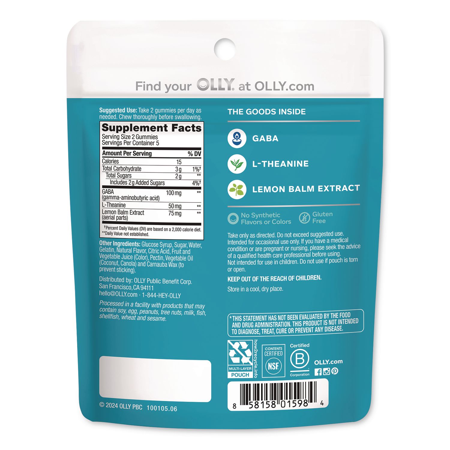 Peace out. This OLLY® Goodbye Stress gummy works fast to help counter the bad vibes, with a boost of just what your body needs to help you stay calm, cool and collected. Fast-working gamma-aminobutyric acid supports a relaxed state of mind to help combat the acute effect of stress. Contains: 100 mg Gamma-Aminobutyric Acid; 75 mg Lemon Balm Extract; 5 mg L-Theanine; Description: 10 Berry Verbena Stress Gummies; Quantity: 10/Pack.