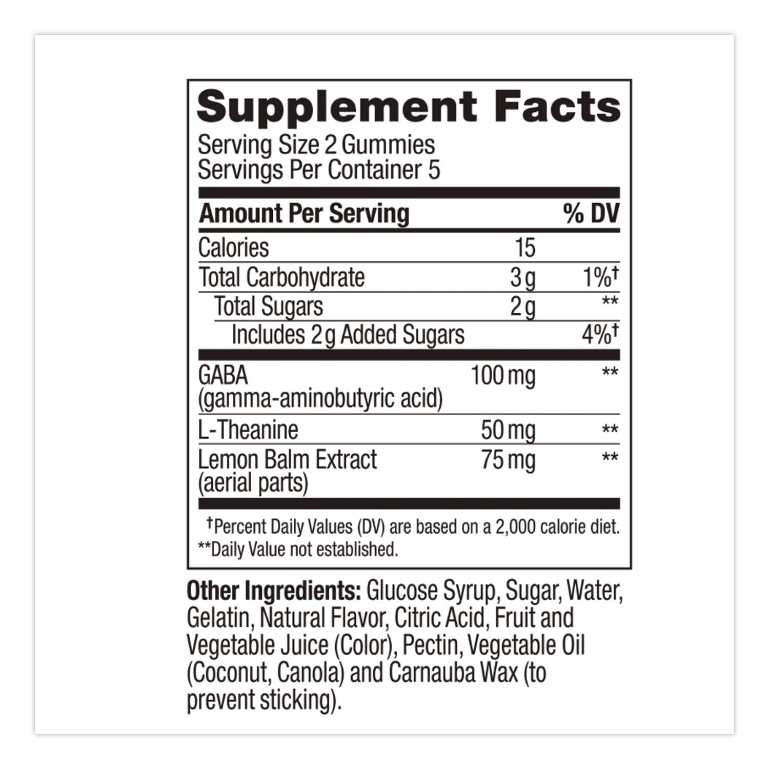 | Contains: | 100 mg Gamma-Aminobutyric Acid; 75 mg Lemon Balm Extract; 5 mg L-Theanine |