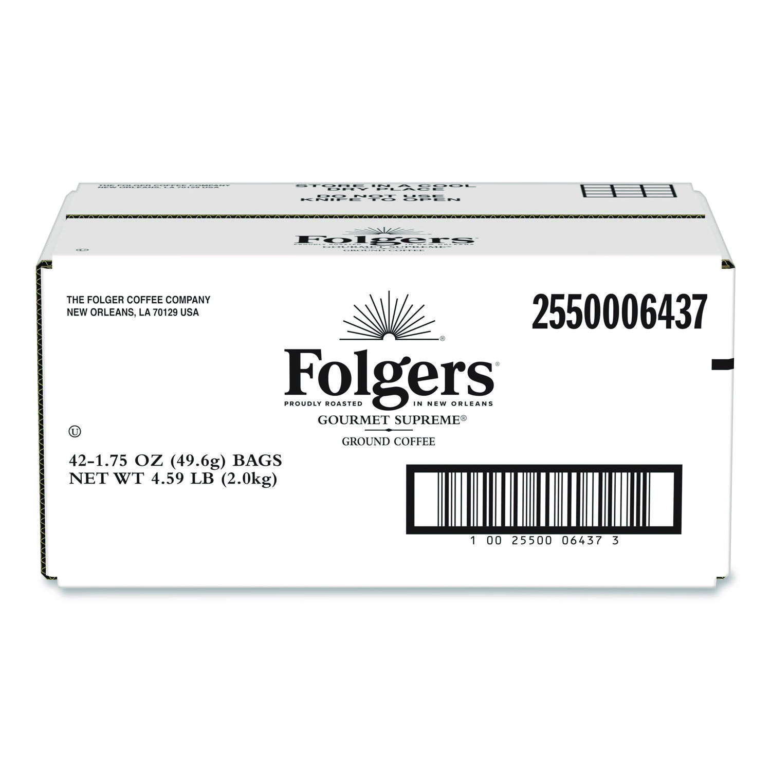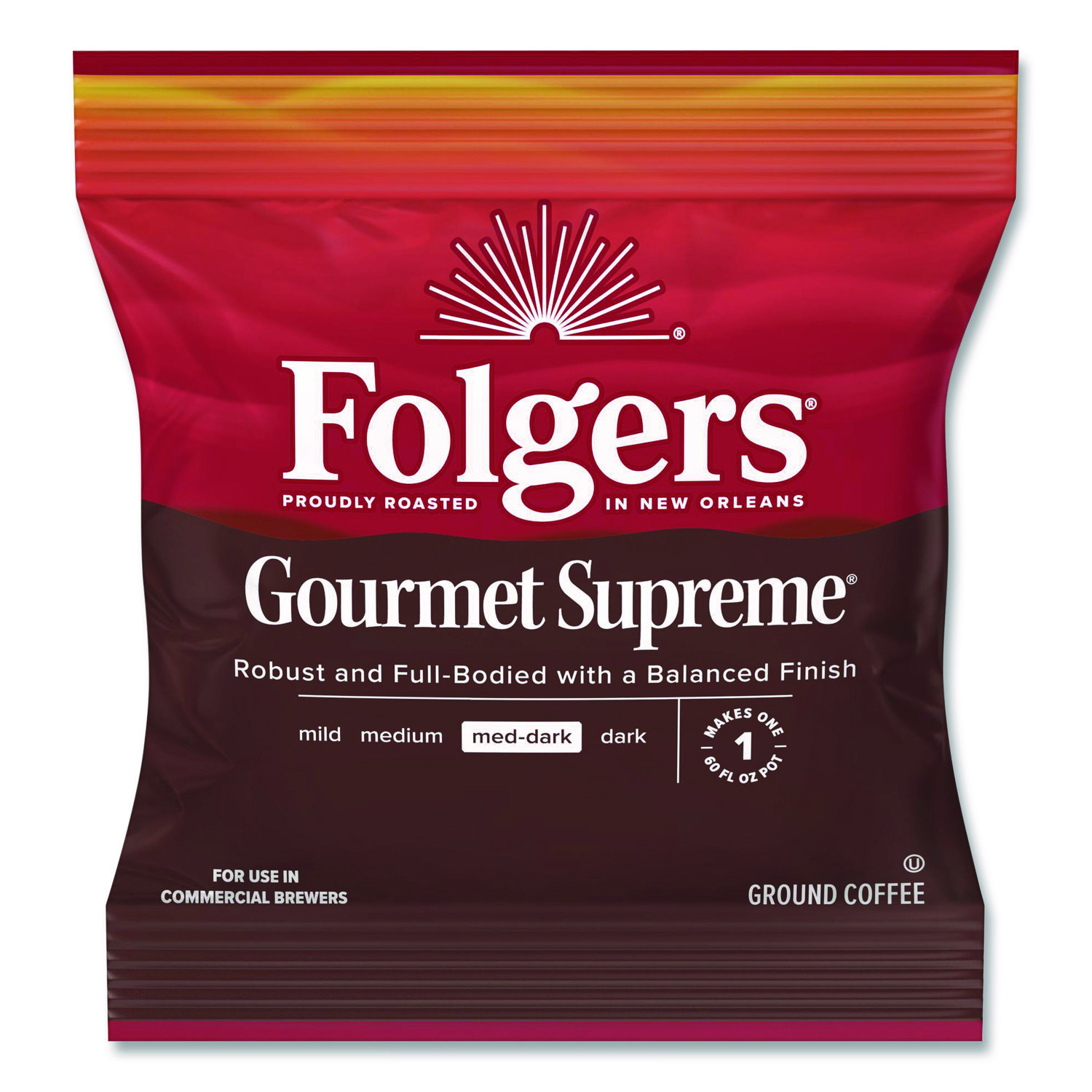 Folgers Gourmet Supreme coffee provides robust, dark-roast flavor and aroma. Convenient fraction packs are a low-touch way to deliver consistent flavor cup after cup. Each pack is premeasured and ready for your commercial coffee brewer. Beverage Type: Coffee; Flavor: Gourmet Supreme; Product Packaging: Fraction Pack; Capacity (Weight): 1.75 oz.