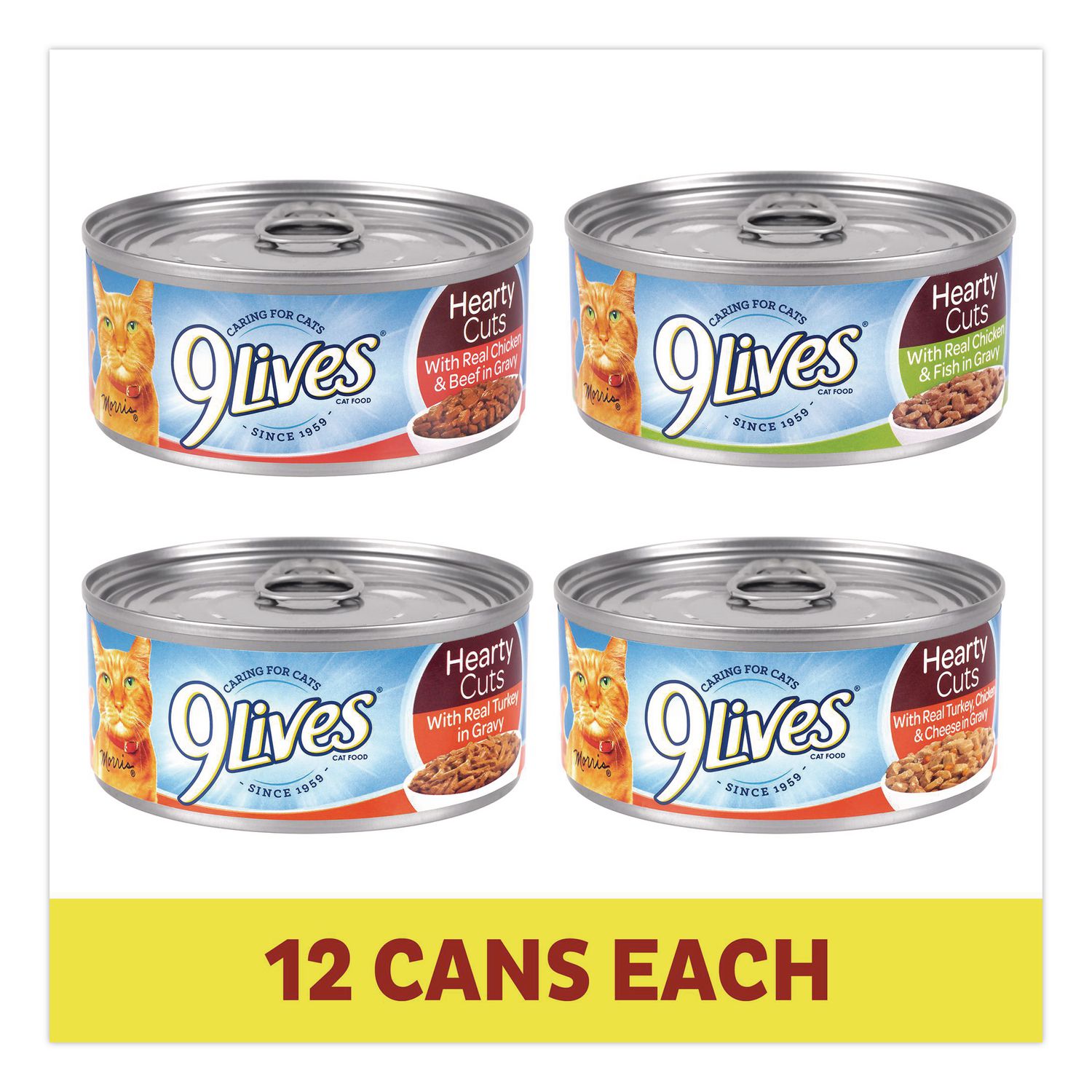 You can indulge your cat with all the delicious flavors and textures found in the 9 Lives ® Gravy Classic Wet Cat Food Variety Pack. The variety pack features hearty cuts which will satisfy your cat with big meaty chunks, cuts and shreds in a thick, rich gravy. Food Type: Wet Cat Food; Flavor: (12) Hearty Cuts with Real Chicken & Beef in Gravy; (12) Hearty Cuts with Real Chicken and Fish in Gravy; (12) Hearty Cuts with Real Turkey in Gravy; (12) Hearty Cuts with Real Turkey Chicken & Cheese in Gravy; Capacity (Weight): 5.5 oz; Sugar Free: No.