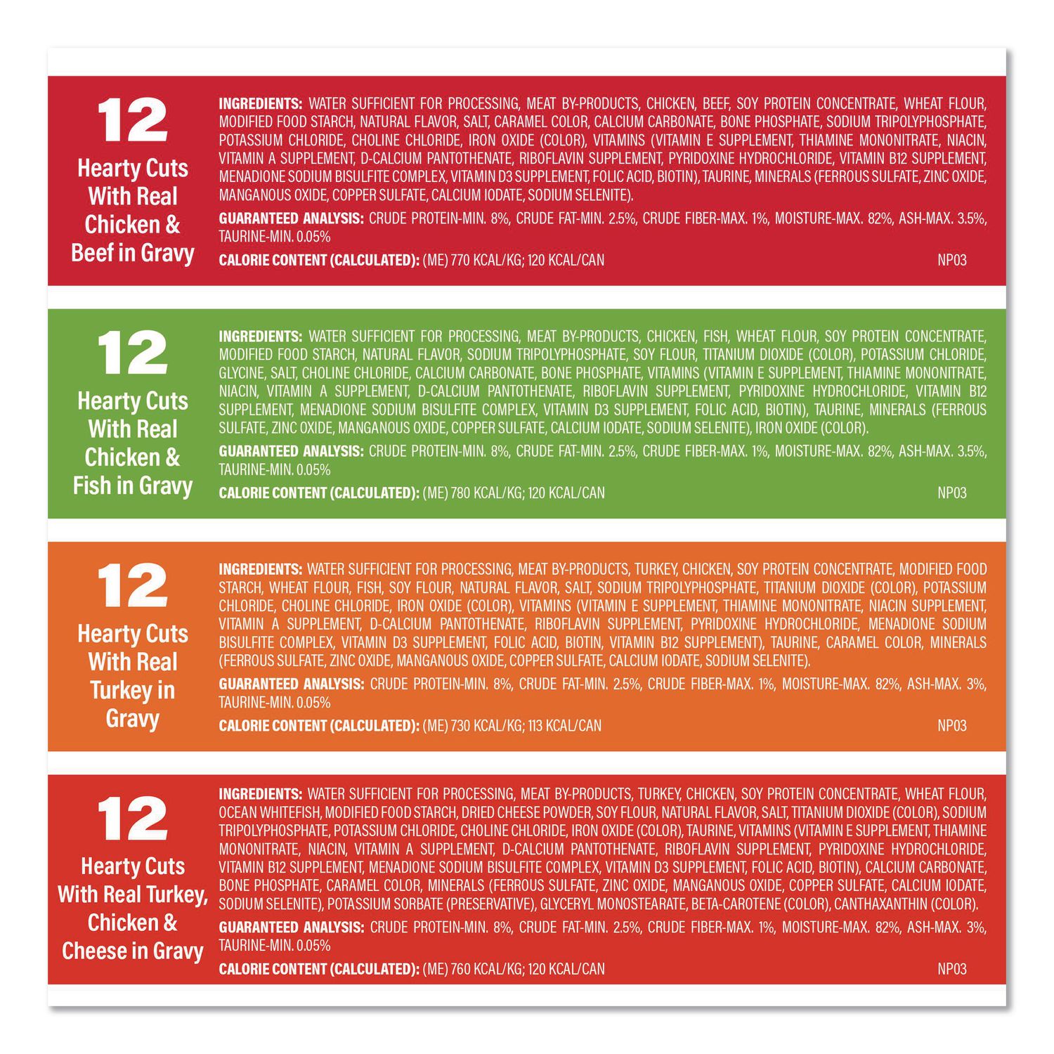 | Flavor: | (12) Hearty Cuts with Real Chicken & Beef in Gravy; (12) Hearty Cuts with Real Chicken and Fish in Gravy; (12) Hearty Cuts with Real Turkey in Gravy; (12) Hearty Cuts with Real Turkey Chicken & Cheese in Gravy |