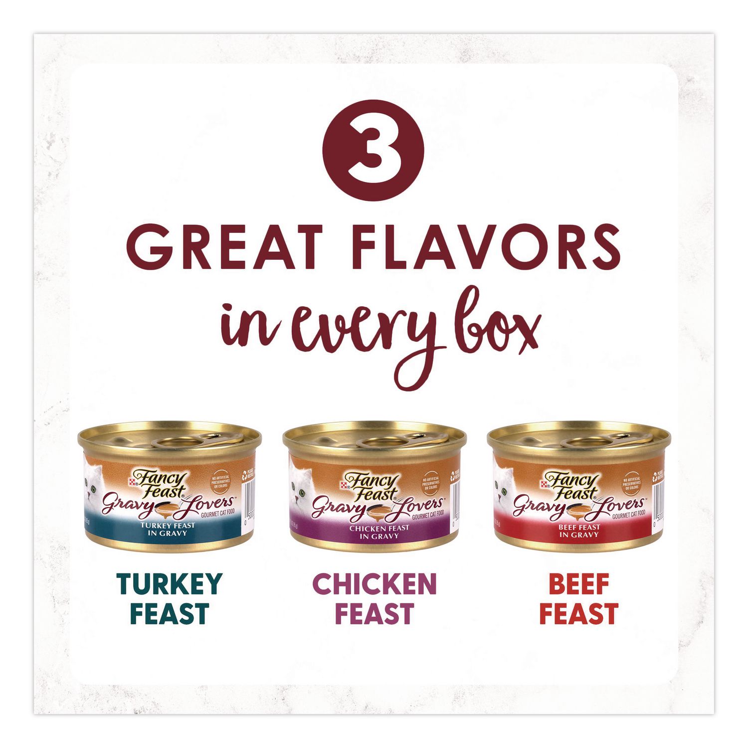 Offer your discerning cat the gourmet tastes she loves with Purina® Fancy Feast® Gravy Lovers Poultry and Beef Feast Collection wet cat food. Chicken, turkey and beef give this collection the savory taste she craves, and the rich gravy in every serving of this canned cat food is sure to have her licking her dish clean to the last drop. Small, delicate bites slow-cooked to perfection deliver a tempting texture, and the assortment of flavors makes it easy to keep your cat’s curiosity piqued at mealtime. With essential vitamins and nutrients to support her overall health and wellness, this gourmet wet cat food lets you feel good about the foods you put into her dish. Offer up a different delectable flavor at each feeding, and show your favorite feline friend just how important she is to you and your family with this collection of mouthwatering Fancy Feast Gravy Lovers cat food cans. Food Type: Cat Food; Flavor: (16) Beef Feast in Gravy; (16) Chicken Feast in Gravy; (16) Turkey Feast in Gravy; Capacity (Weight): 3 oz; Sugar Free: No.