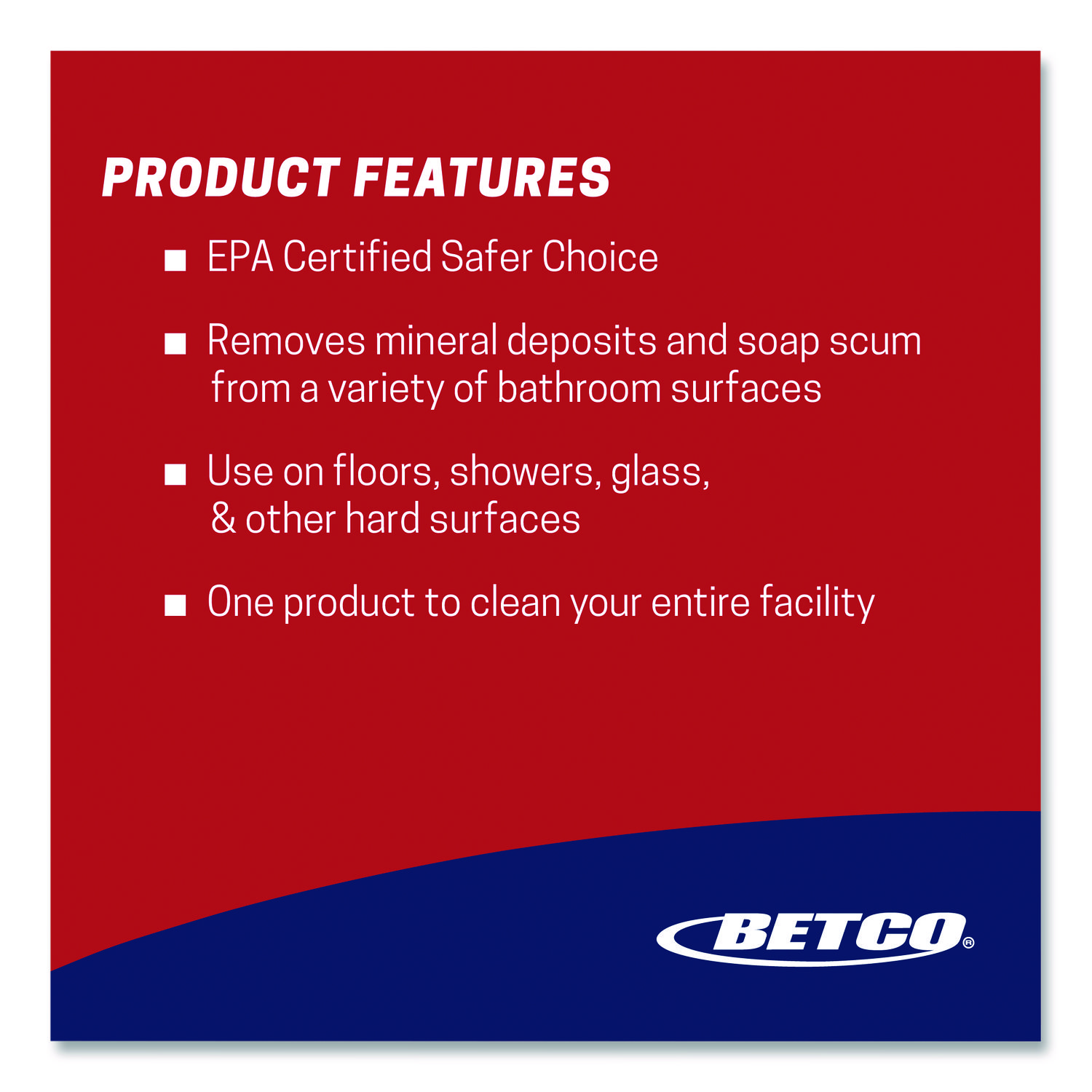 Betco Green Earth peroxide cleaner is for daily use on floors, showers, glass, and other hard surfaces. This one product can clean your entire facility. Removes mold stains, mineral deposits and soap scum on tile, grout, bathtub surfaces, and fixtures. Application: All-Purpose; Applicable Material: Floor; Fixtures; Glass; Grout; Shower; Tile; Tubs; Dirt Types: Mineral Deposits; Mold; Soap Scum; Scent: Fresh Mint.