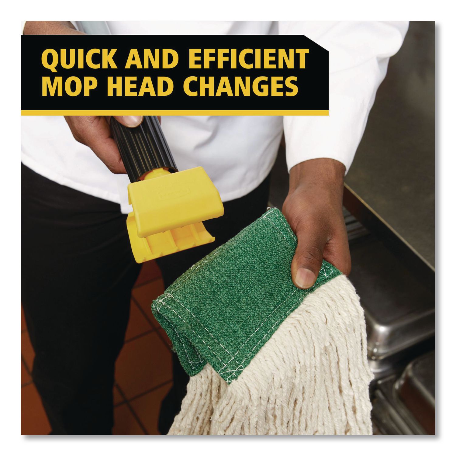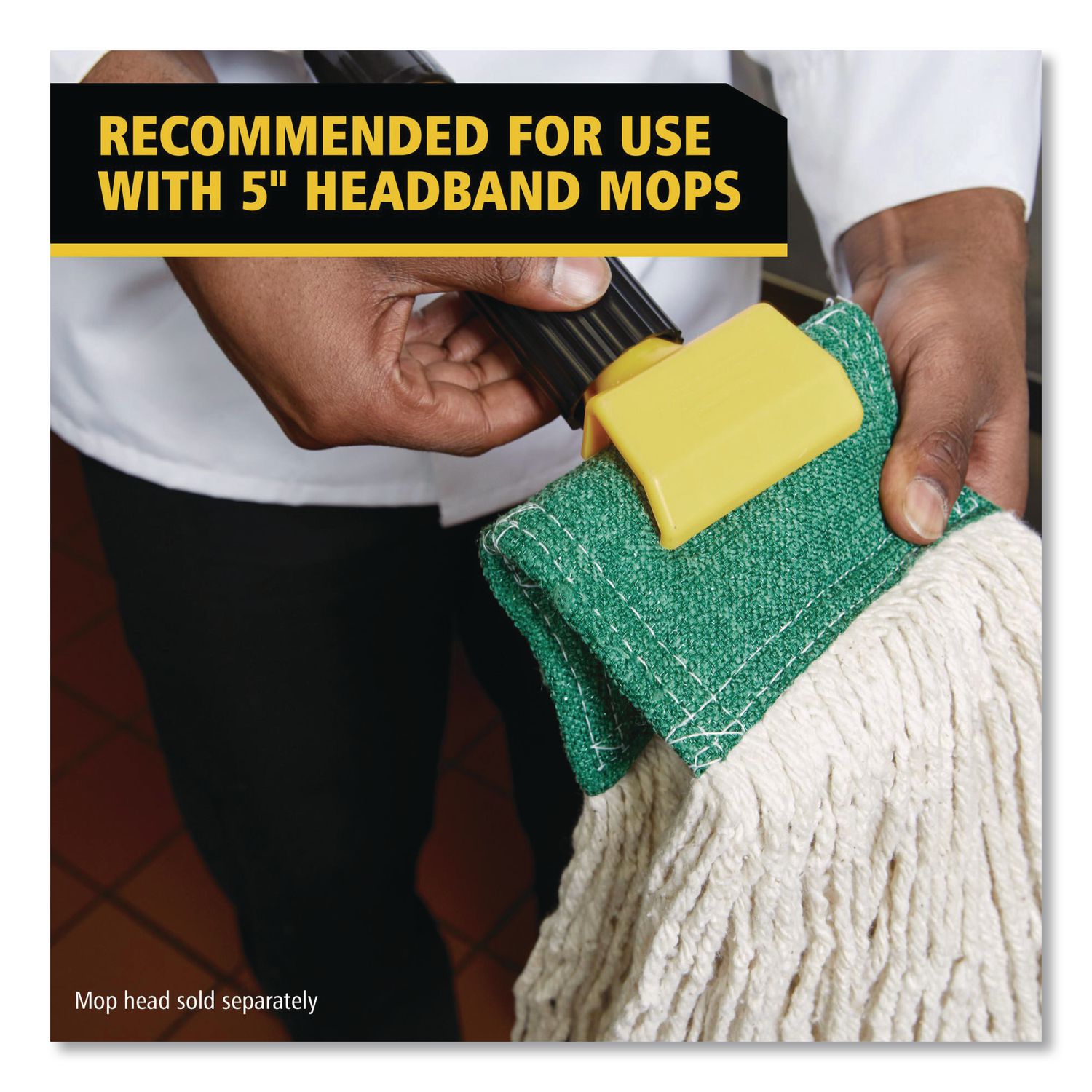Plastic jaws firmly grip mop head. Allows quick mop changes. Ideal for 5″ wide headband mops. Handle Length: 60″; Handle Diameter: 1″; Handle Material(s): Fiberglass; Color(s): Gray/Yellow.