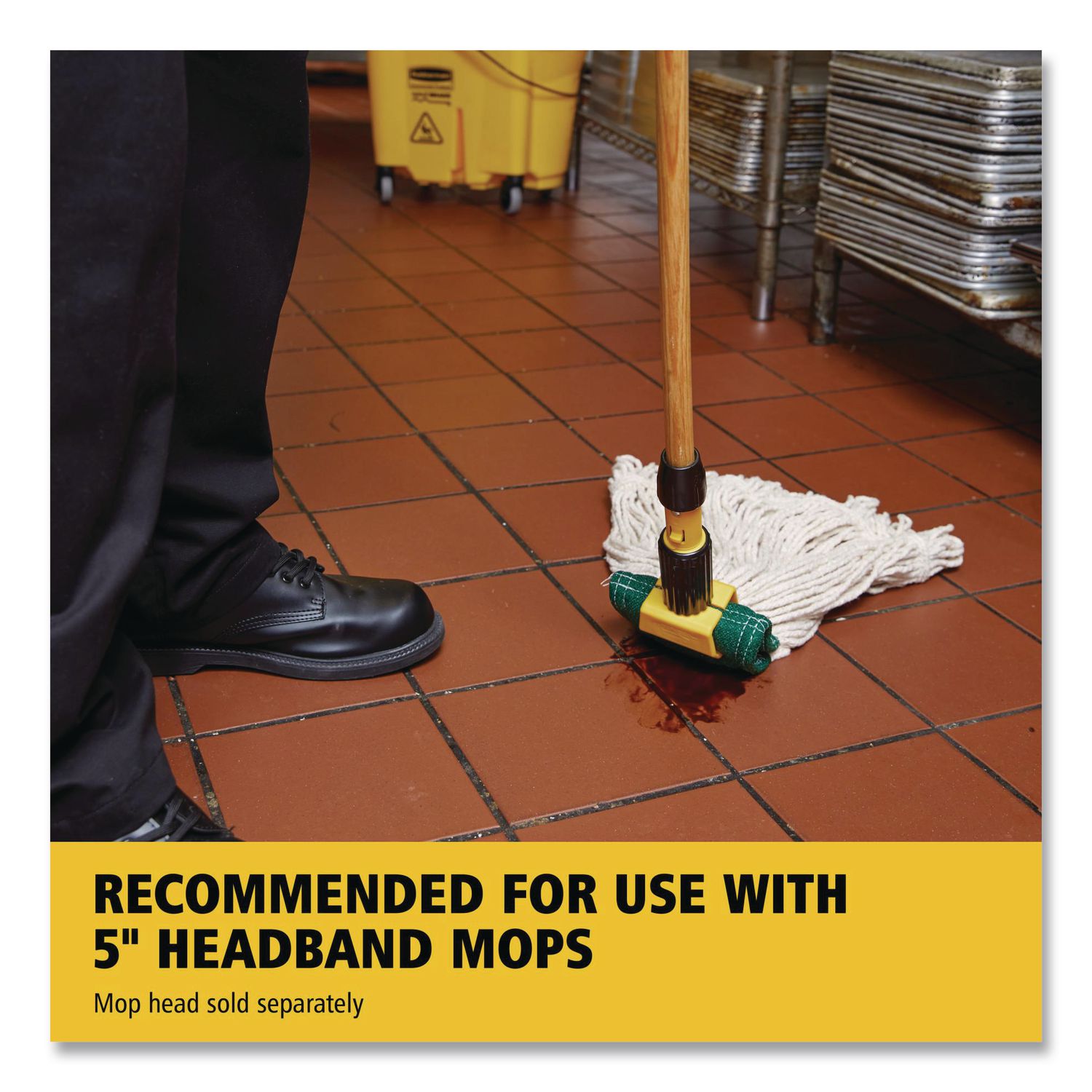 Plastic jaws firmly grip mop head. Allows quick mop changes. Ideal for 5″ wide headband mops. Handle Length: 60″; Handle Diameter: 1.13″; Handle Material(s): Wood; Color(s): Natural/Yellow.