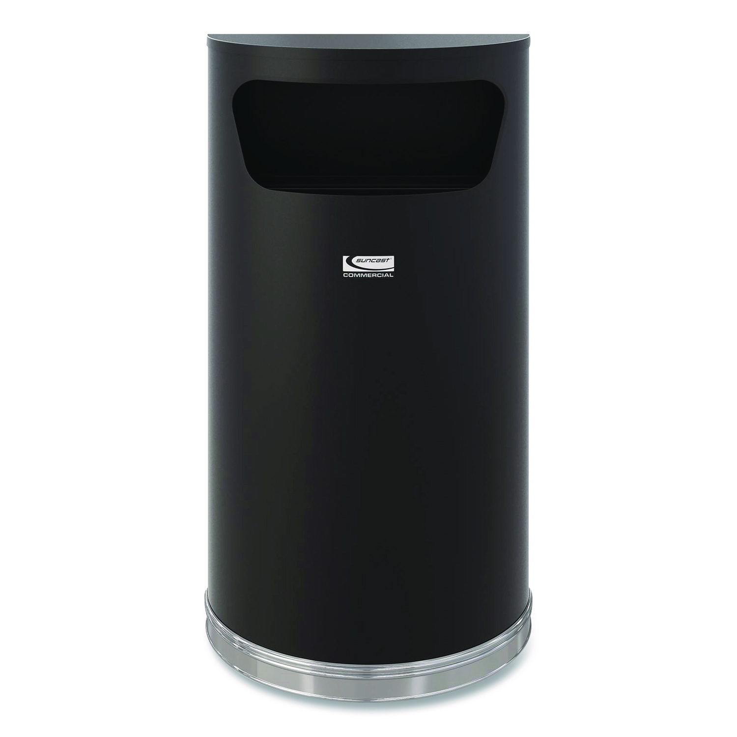 The Suncast Commercial® Half-Round Metal Trash Can is constructed of durable steel. This crescent trash can comes fully assembled, including a high density polyethylene liner for easy waste removal. With a sleek professional appearance, this decorative trash can is perfect for lobbies, shopping centers or any high traffic areas or businesses. Waste Receptacle Type: Indoor/Outdoor All-Purpose Waste Bin; Material(s): Steel; Application: Indoor/Outdoor All-Purpose Waste Disposal; Interior Volume Capacity: 9 gal.