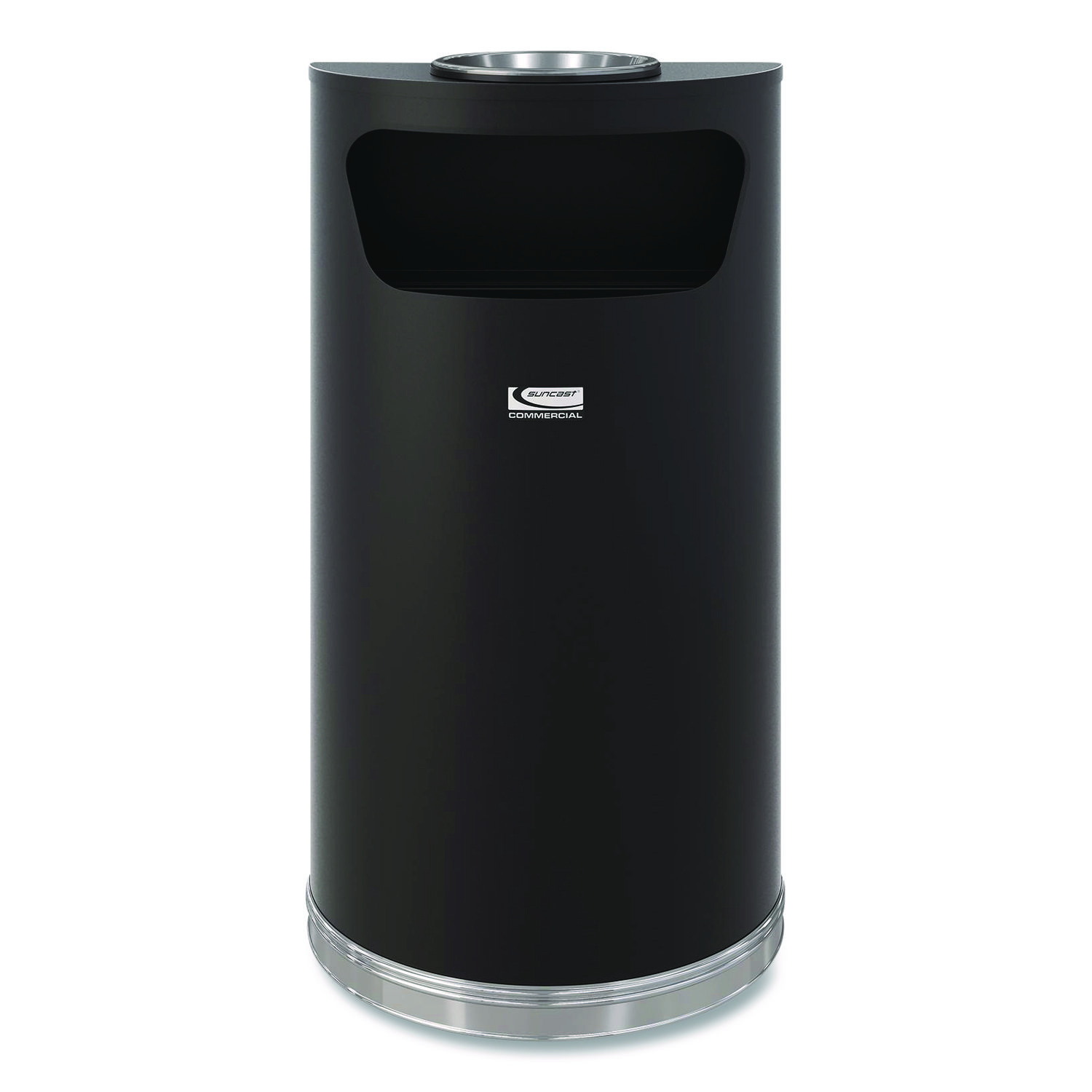 The Suncast Commercial® Half-Round Metal Trash Can with Ashtray is constructed of durable steel. This crescent trash can comes fully assembled, including a high density polyethylene liner for easy waste removal. With a sleek professional appearance, this decorative trash can is perfect for lobbies, shopping centers or any high traffic areas or businesses. Waste Receptacle Type: Ashtray Waste Bin; Material(s): Steel; Application: Outdoor All-Purpose Waste Disposal/Tobacco Product Waste Collection; Interior Volume Capacity: 9 gal.