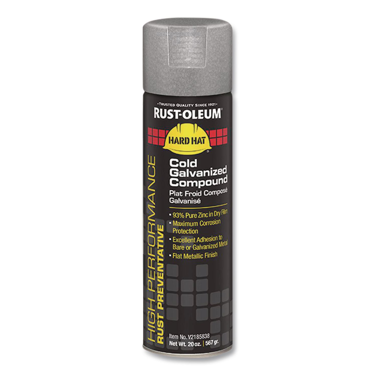 Rust-Oleum Hard Hat High Performance V2100 System Rust Preventive Cold Galvanizing Compound is a zinc-rich compound spray paint for galvanized surfaces. This fast-drying, solvent-based coating provides excellent corrosion protection in moderate to severe industrial environments. Two-year rust-proof guarantee. Touch up and repair galvanized surfaces for production welds, galvanized ducts, damaged galvanized steel, storage tanks, fences, gutters, trucks, trailers, utility towers and more. The extra-wide comfort nozzle reduces finger fatigue and sprays from any angle for easy, hassle-free application. High-output spray tip ensures faster project completion. Paint Sub-Category: Spray Paint; Intended Application Environment: Interior/Exterior; Finish/Sheen: Flat; Color(s): Gray.