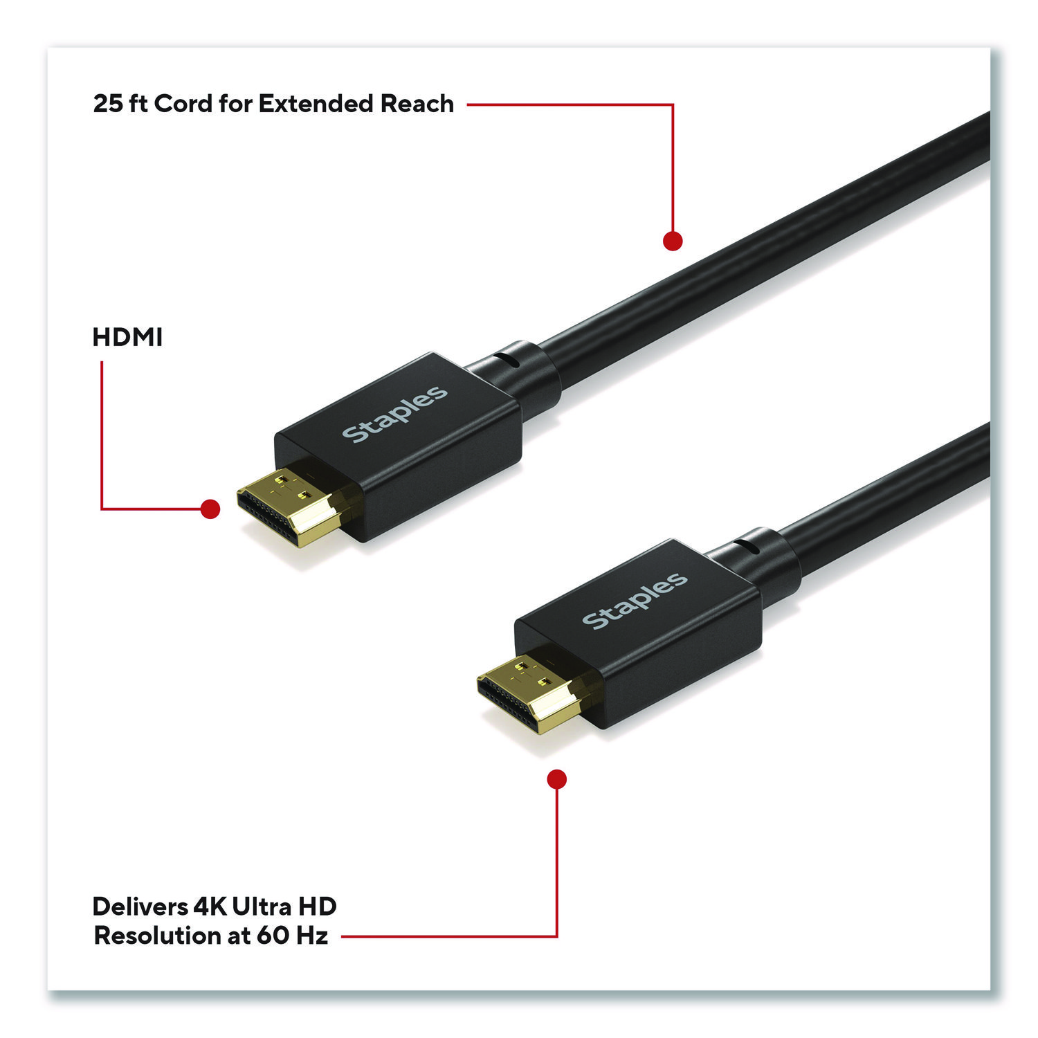 Delivering crisp 4K Ultra HD resolution, this HDMI cable promises clear audio and video for an exceptional experience. It will give you ample length to connect devices across your work or entertainment station. This cord is the perfect choice for outfitting your work, gaming or media space. Enjoy high resolution audio and video between devices so you can upgrade your home or office workspace and do your best work. Cable Type: HDMI; Connector/Port/Interface: HDMI Male; HDMI Male; Cable Length: 25 ft; Jacket Color: Black.