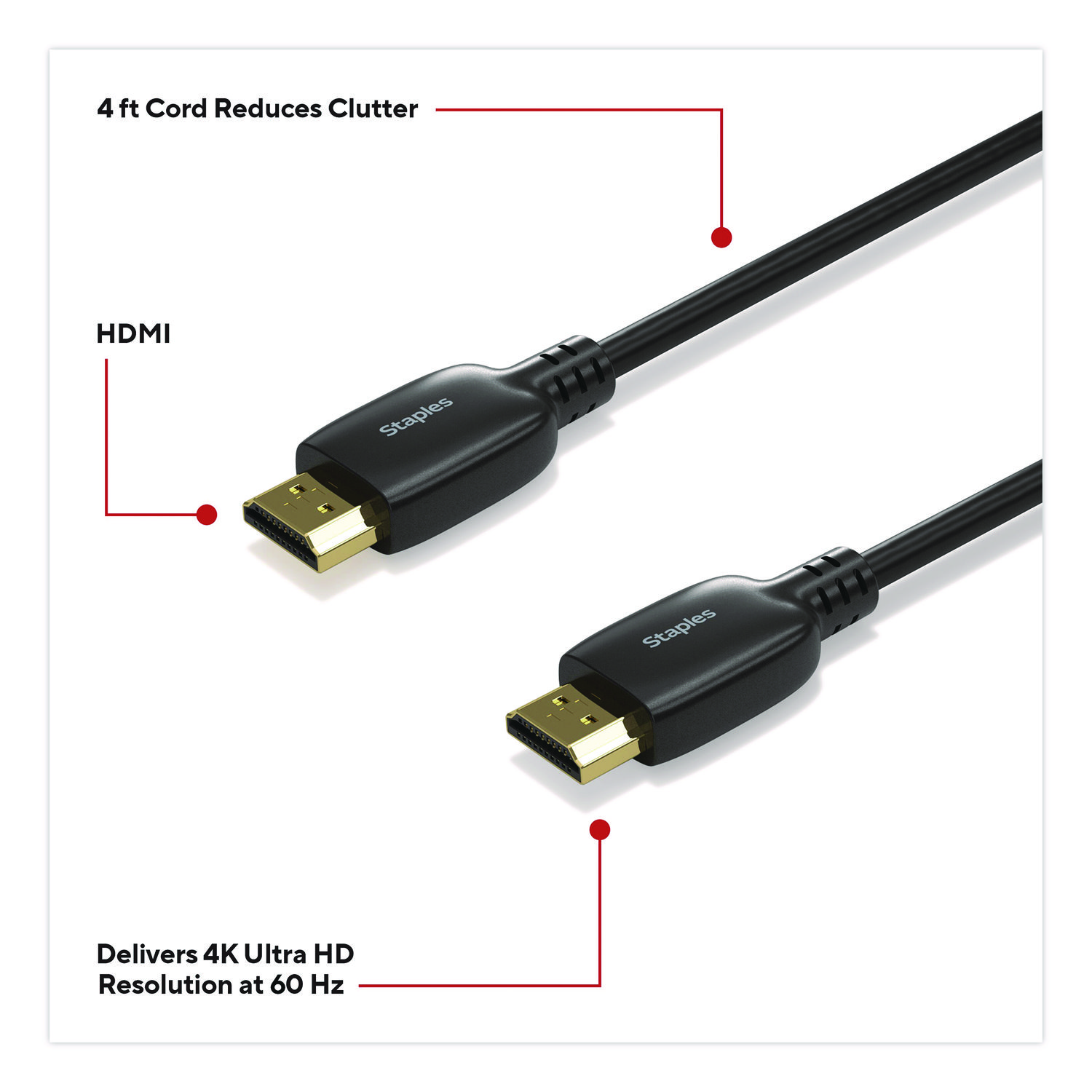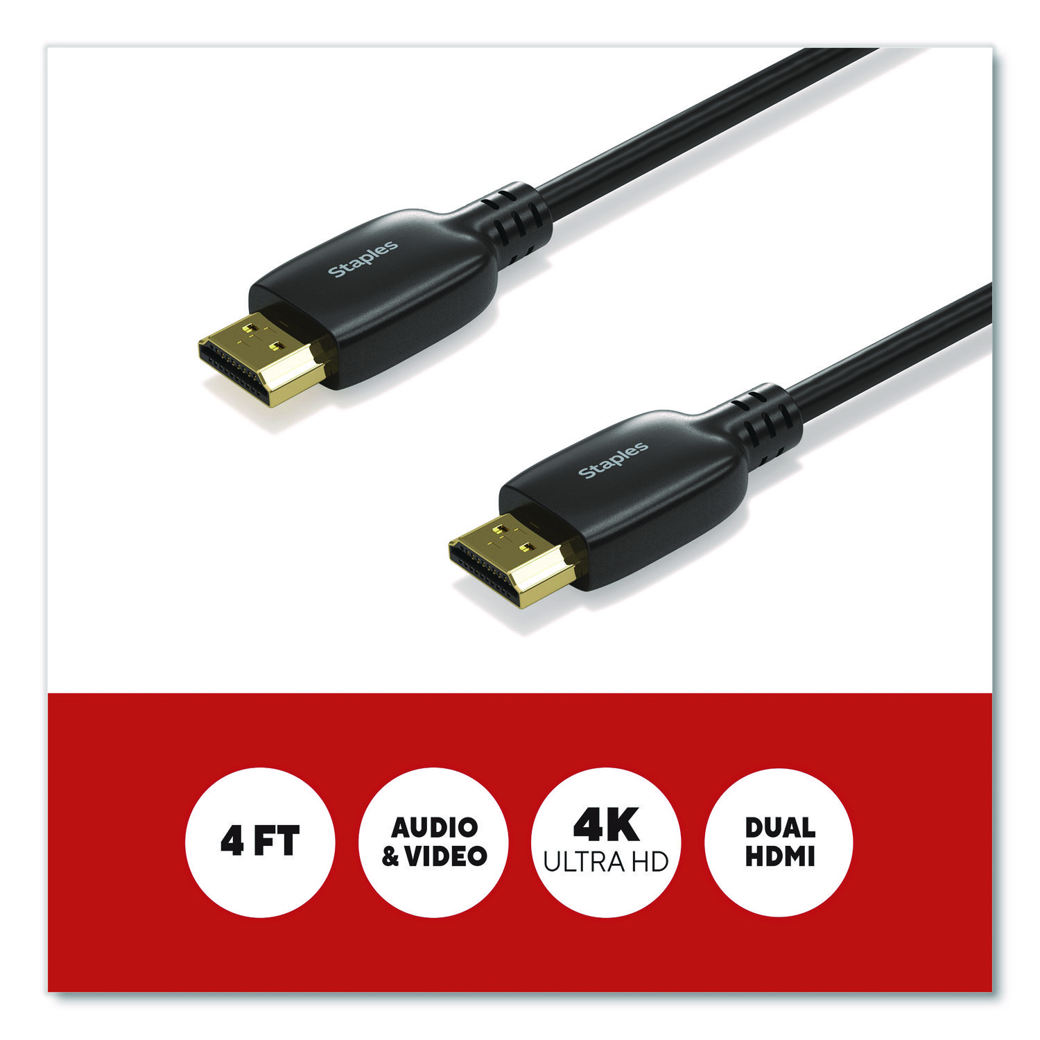 Delivering crisp 4K Ultra HD resolution, this HDMI cable promises clear audio and video for an exceptional experience. It will give you ample length to connect devices across your work or entertainment station. This cord is the perfect choice for outfitting your work, gaming or media space. Enjoy high resolution audio and video between devices so you can upgrade your home or office workspace and do your best work. Cable Type: HDMI; Connector/Port/Interface: HDMI Male; HDMI Male; Cable Length: 4 ft; Jacket Color: Black.