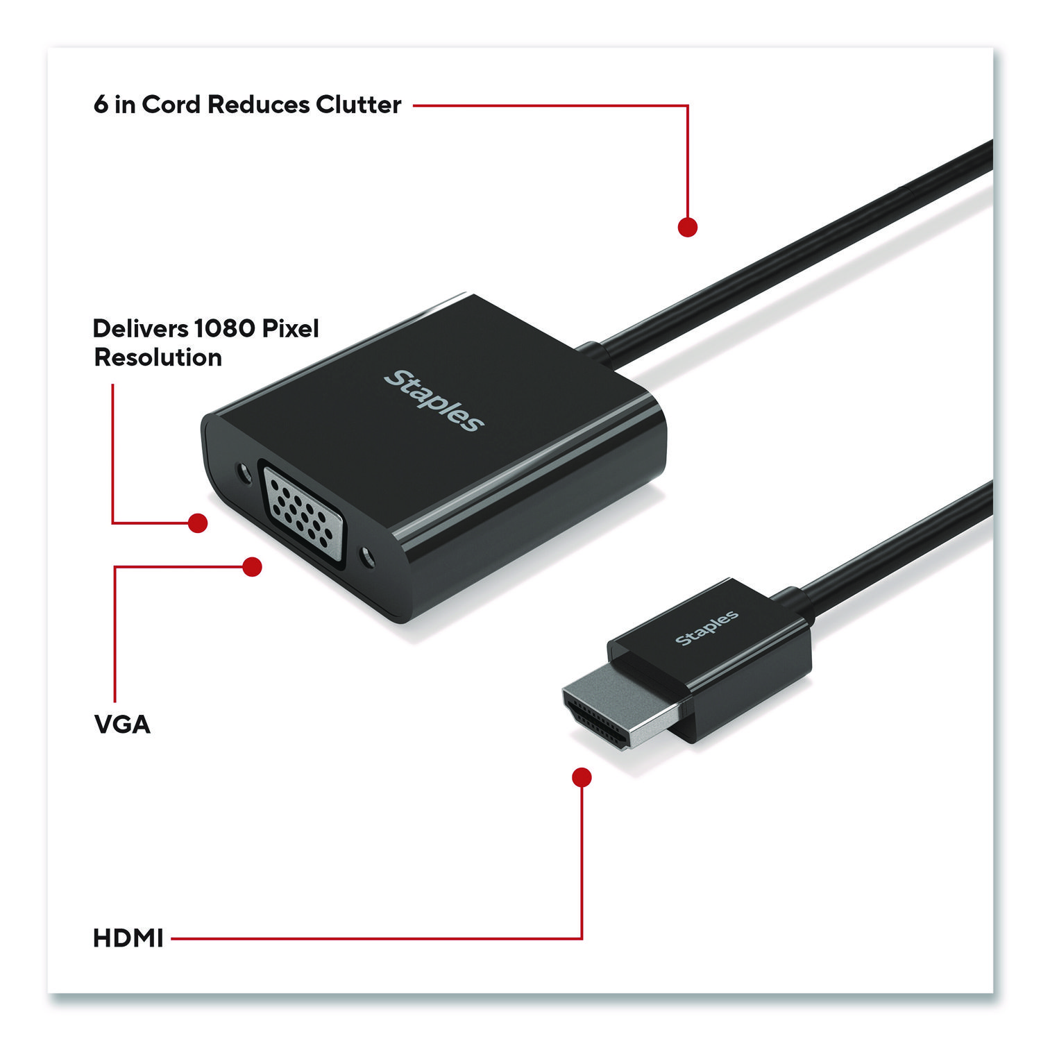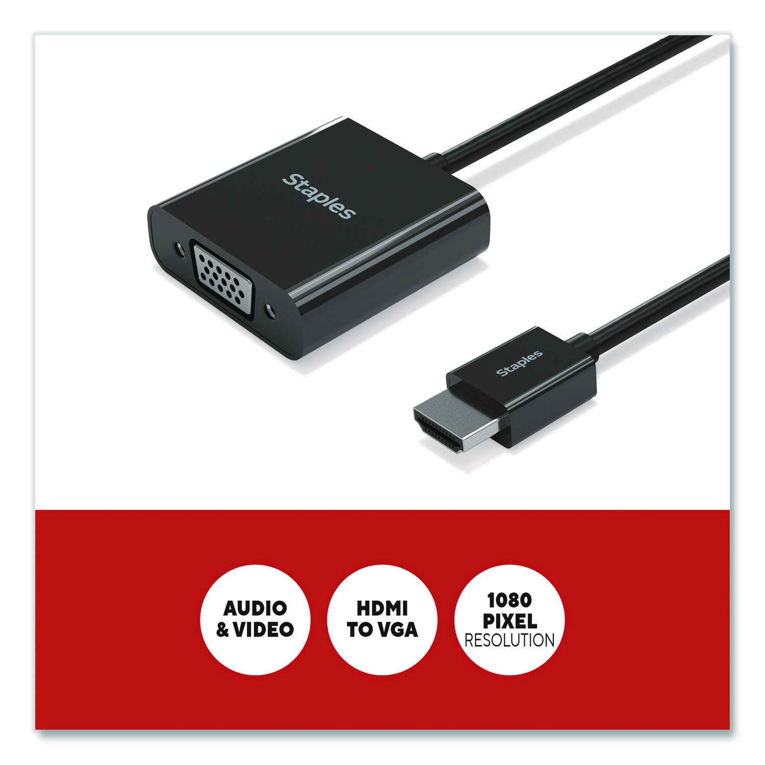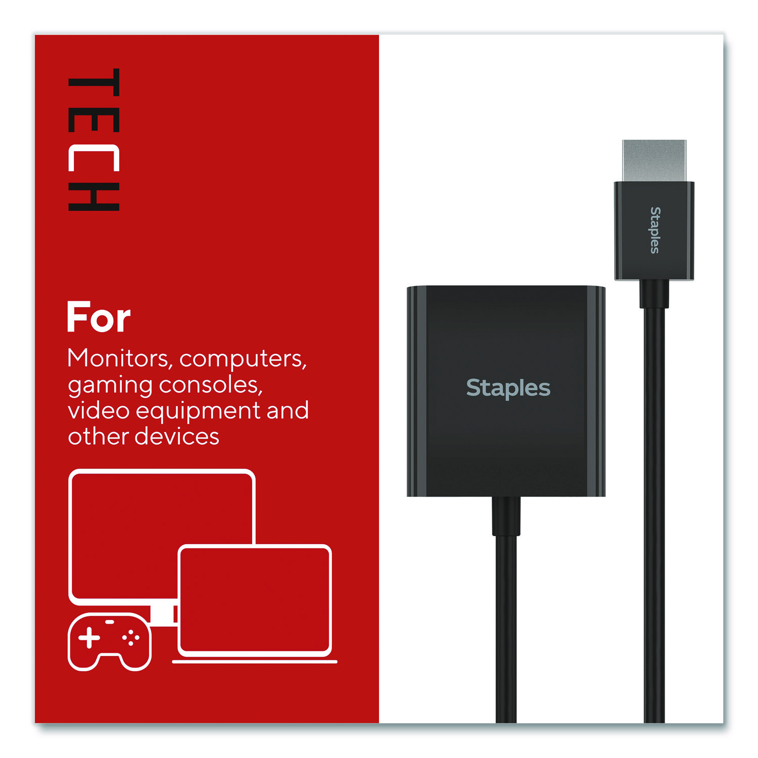 For work or entertainment an extra display often comes in handy. With the Staples TECH HDMI to VGA adapter, you can convert a HDMI output to a VGA input to connect additional monitors, displays, gaming consoles, projectors and more. Delivering 1920 x 1200 pixel resolution, this adapter promises quality video for a seamless experience. Featuring a compact 6″ cord, this adapter will keep your work or entrainment space clutter free. This adapter is the perfect choice for outfitting your work, gaming or entertainment space. Enjoy seamless connectivity between previously incompatible devices so you can upgrade your home or office workspace and do your best work. Cable Type: HDMI to VGA; Connector/Port/Interface: HDMI; VGA; For Device Type: HDMI Devices; Cable Length: 6″.
