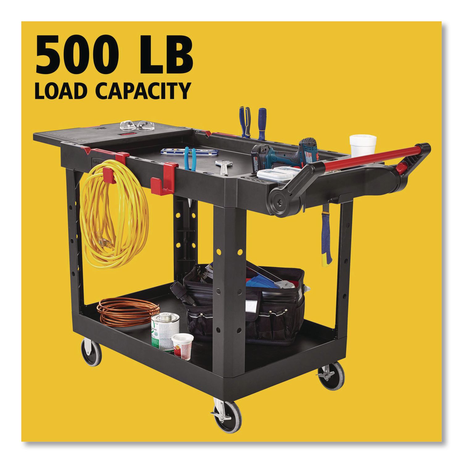 The heavy-duty adaptable cart provides superior versatility for tackling whatever task is at hand. Crafted of structural foam, this rolling service and utility cart can support up to 250 lb per shelf while reducing the need for time-consuming user modifications Features a variety of integrated features including an ergonomic adjustable handle with four positions for maximum comfort, a flip-up shelf, a slotted rim for small tool storage, two snap-in hooks for wrapping extension cords and locking casters to keep the cart stable during use. Material(s): High-Density Polyethylene Foam (HDPE); Overall Material Type: Plastic; Color(s): Black; Color Family: Black.
