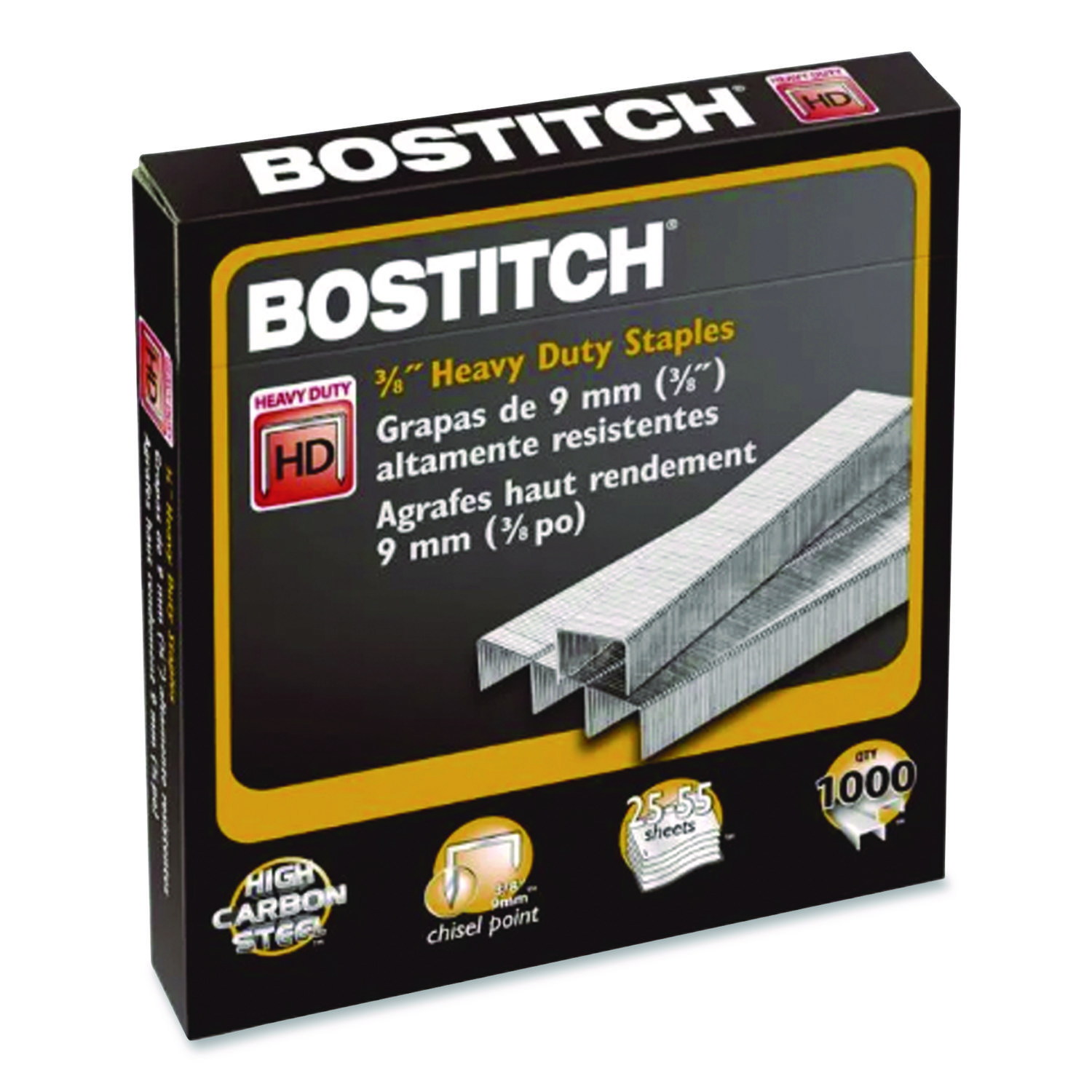 Stanley Bostitch heavy duty staples are made with premium quality steel with extra high carbon content. Designed with chisel point tips for maximum penetration power. Staple Collation: Half-Strip; Staples per Strip/Cartridge: 100; Sheet Capacity: 55; Leg Length: 0.38″.