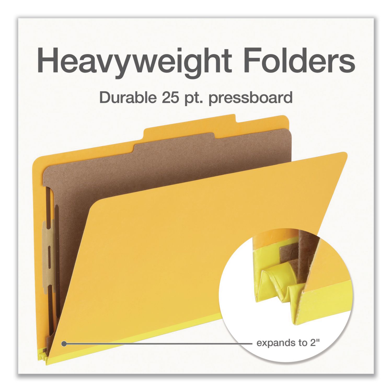 Heavy-Duty Pressboard Classification Folder, 2/5-Cut Tab, Expands 2″, 1 Divider, 4 Fasteners, Legal Size, Yellow, 10/Box