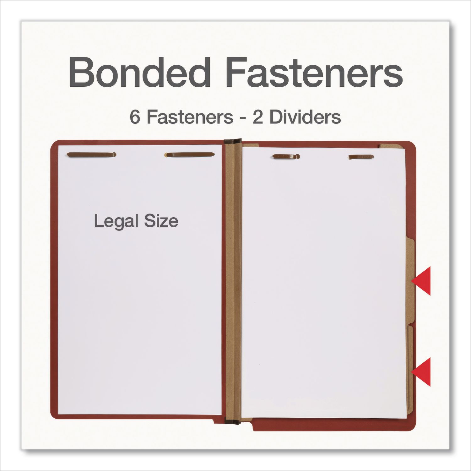 These pressboard classification folders have fasteners to keep your documents in order and in place and dividers to categorize your paperwork. Made from heavyweight 25 pt. paper to better withstand wear and tear. Bonded fasteners keep paperwork ordered. Each folder is scored along the bottom so you can expand it to fit more paper inside. Keep your paperwork ordered and easy to find. These folders have end tabs so your labels are always in view (does not include sticker labels). Folder Size: Legal; Total Number of Dividers: 2; Total Number of Fasteners: 6; Cover Tab Style: End Tab.