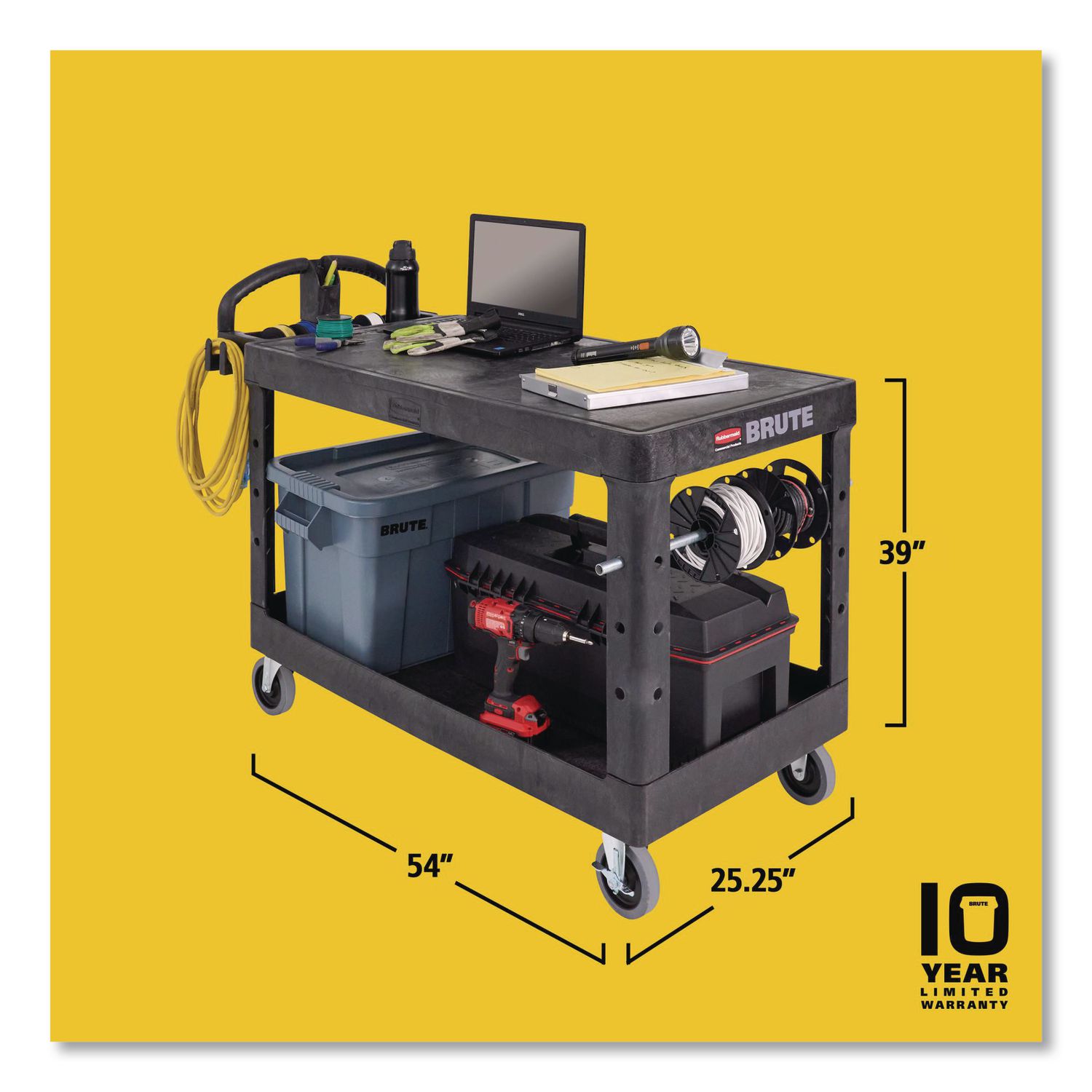 Heavy-Duty Utility Cart with Flat Shelves, Plastic, 2 Shelves, 500 lb Capacity, 25.25″ x 54″ x 36″, Black