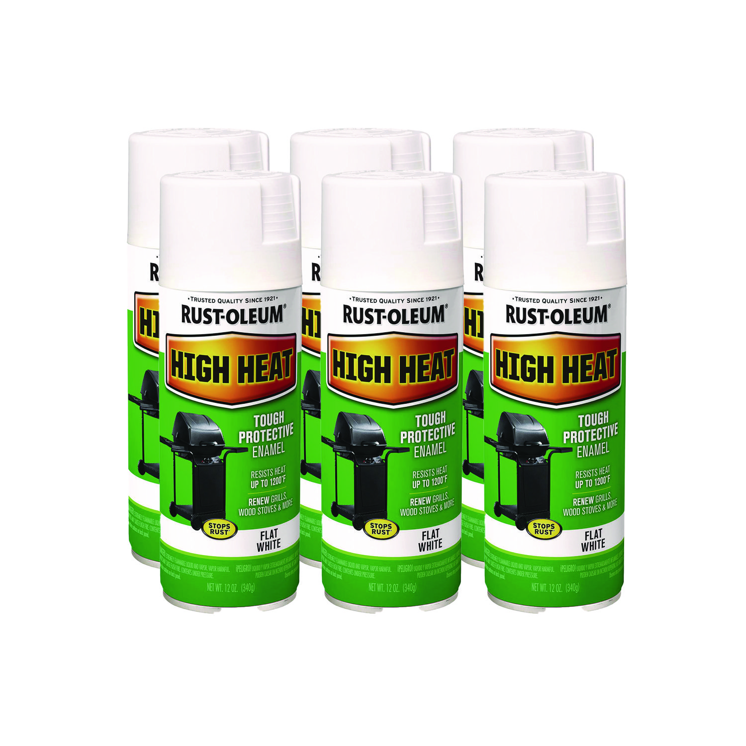 Rust-Oleum High Heat Spray Paint is a rust-preventive enamel designed to provide deep color and rich sheen to protect indoor and outdoor high heat applications. This durable finish retains excellent color retention after repeated heating. High heat sprays withstand temperatures up to 1,200º F. Ideal for the exterior of barbecue grills, wood stoves, radiators, fire pits, fireplace screens, automotive parts and more. Paint Sub-Category: Enamel; Intended Application Environment: Interior/Exterior; Finish/Sheen: Flat; Color(s): White.