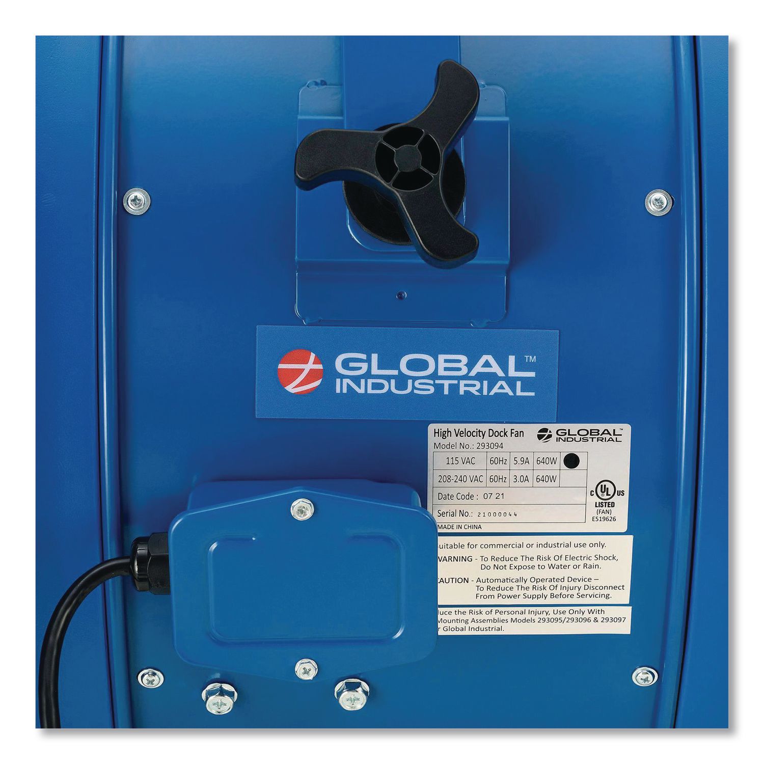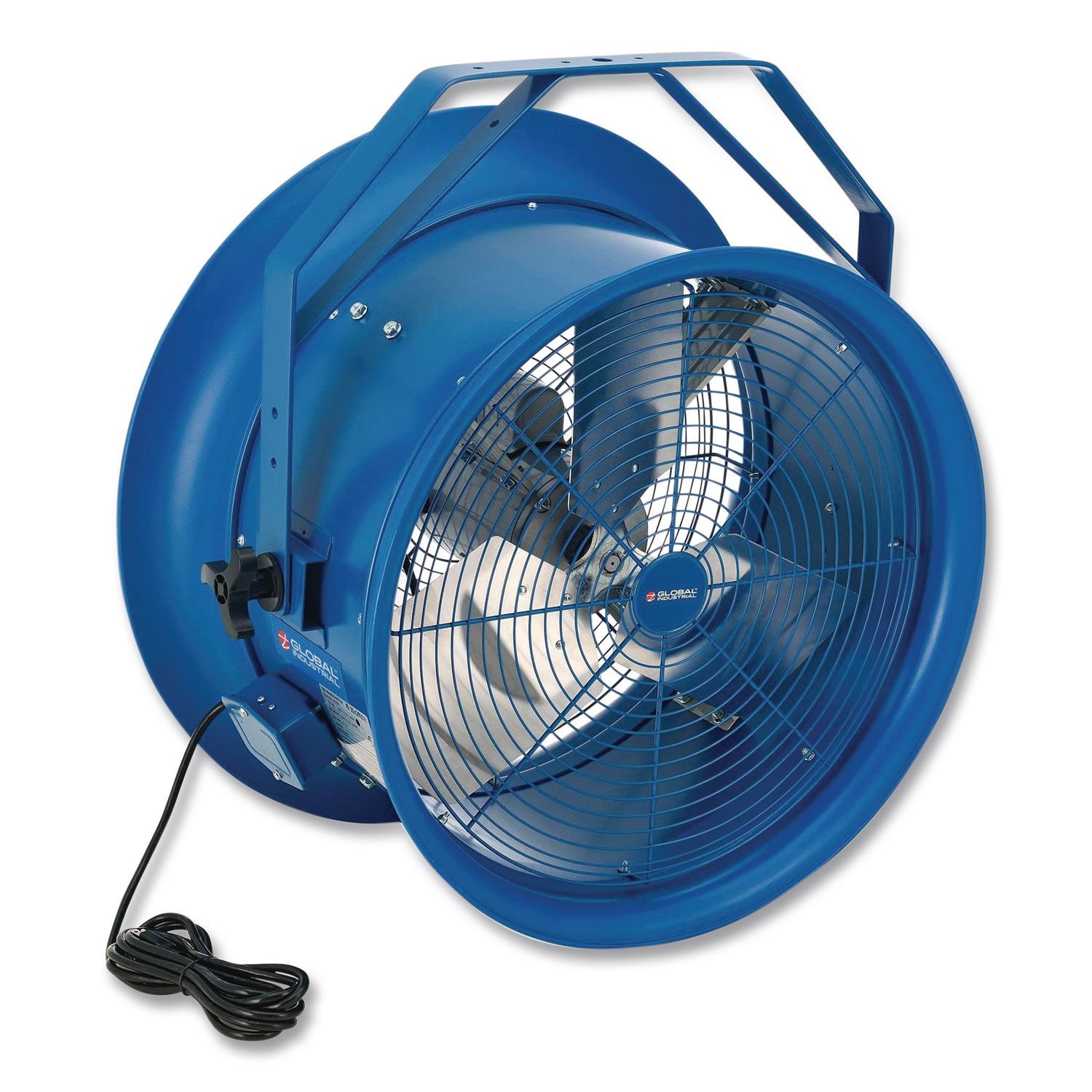 Designed to project large amounts of air long distances, the High Velocity Drum Fan provides fresh air on loading docks, in warehouses, and down assembly lines, or to dry out after a flood and exhaust fumes. It has an efficient single-speed direct-drove TEAO (Totally Enclosed Air Over) motor with three galvanized aluminum fan blades. It comes with a yoke mount connected to a mounting assembly for installation on a wall or column. Fan Head Size: 22″; Fan Type: Industrial; Oscillates: No; Color(s): Blue.