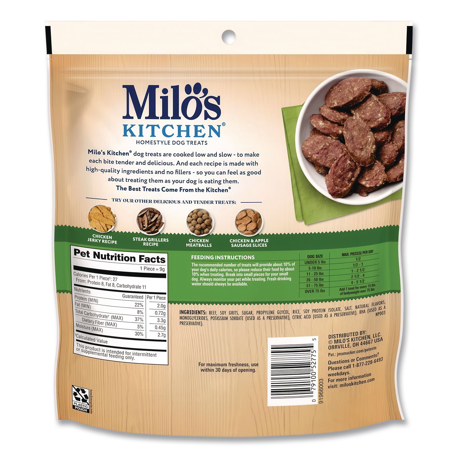 Great tasting, homestyle recipe made with 100% real meat as the #1 ingredient. Show your dog love with a deliciously wholesome snack that’s made to perfection without artificial flavors or colors. Food Type: Dog Treats; Flavor: Beef Sausage Slices with Rice; Capacity (Weight): 10 oz; Product Packaging: Pouch.