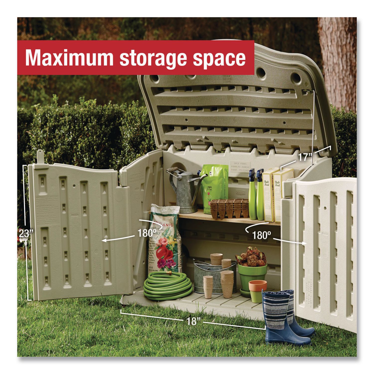Freestanding, weather-resistant and stay-dry resin horizontal design outdoor shed. With a large 20 cu. ft. storage capacity, this horizontal garden shed offers the ideal storage for garden tools, cushions, garden accessories and bins. With a padlock clasp (padlock not included), you can be sure that your tools are safely stored and secure. Lift up lid with prop rod and tough, durable floor included. Accommodates wood shelf (not included), lockable doors and lid. Easily assembles in less than 30 minutes. Color(s): Olive Green/Sandstone; Interior Volume Capacity: 20 cu ft; Material(s): Polypropylene; Resin; Structural Foam; Overall Outer Width: 55″.