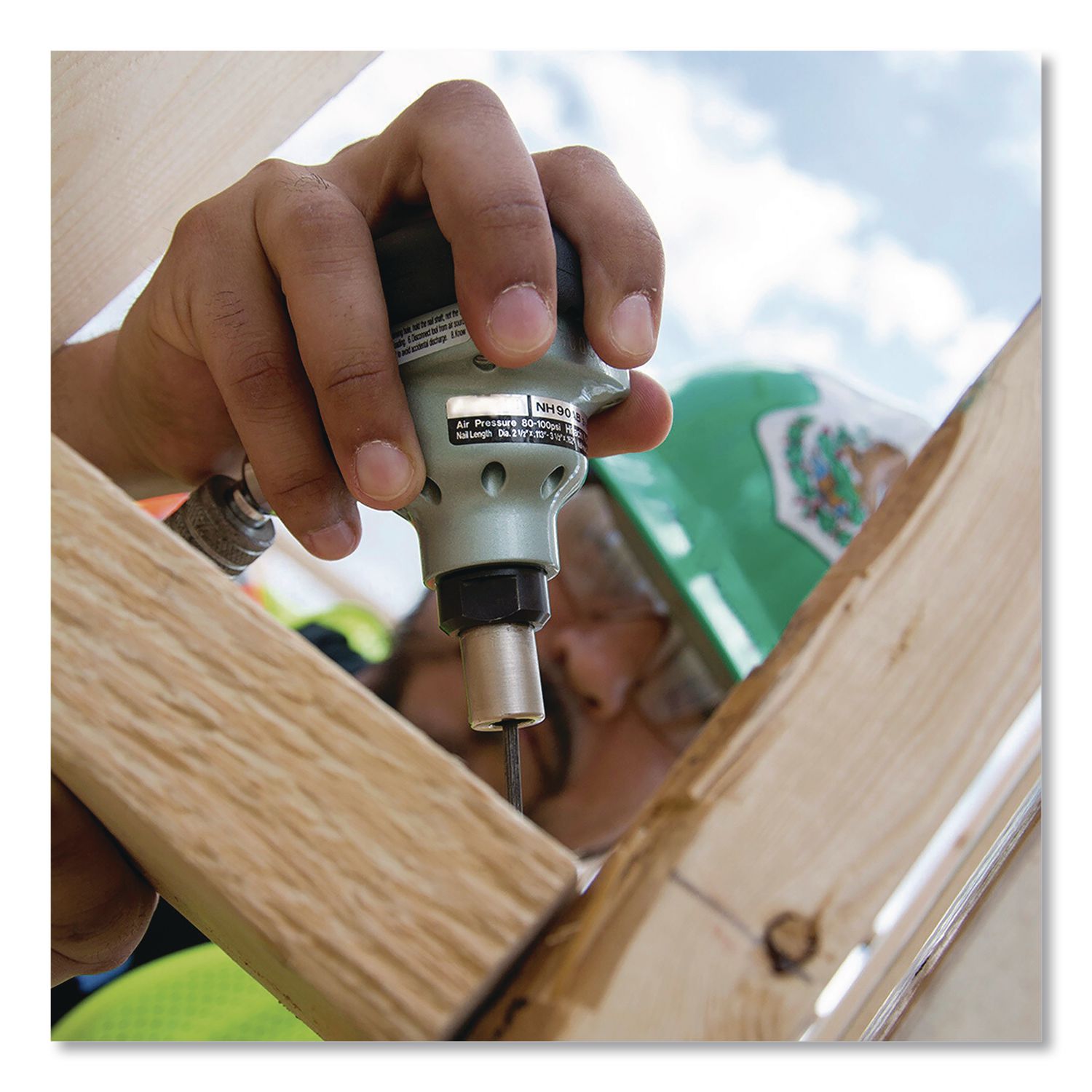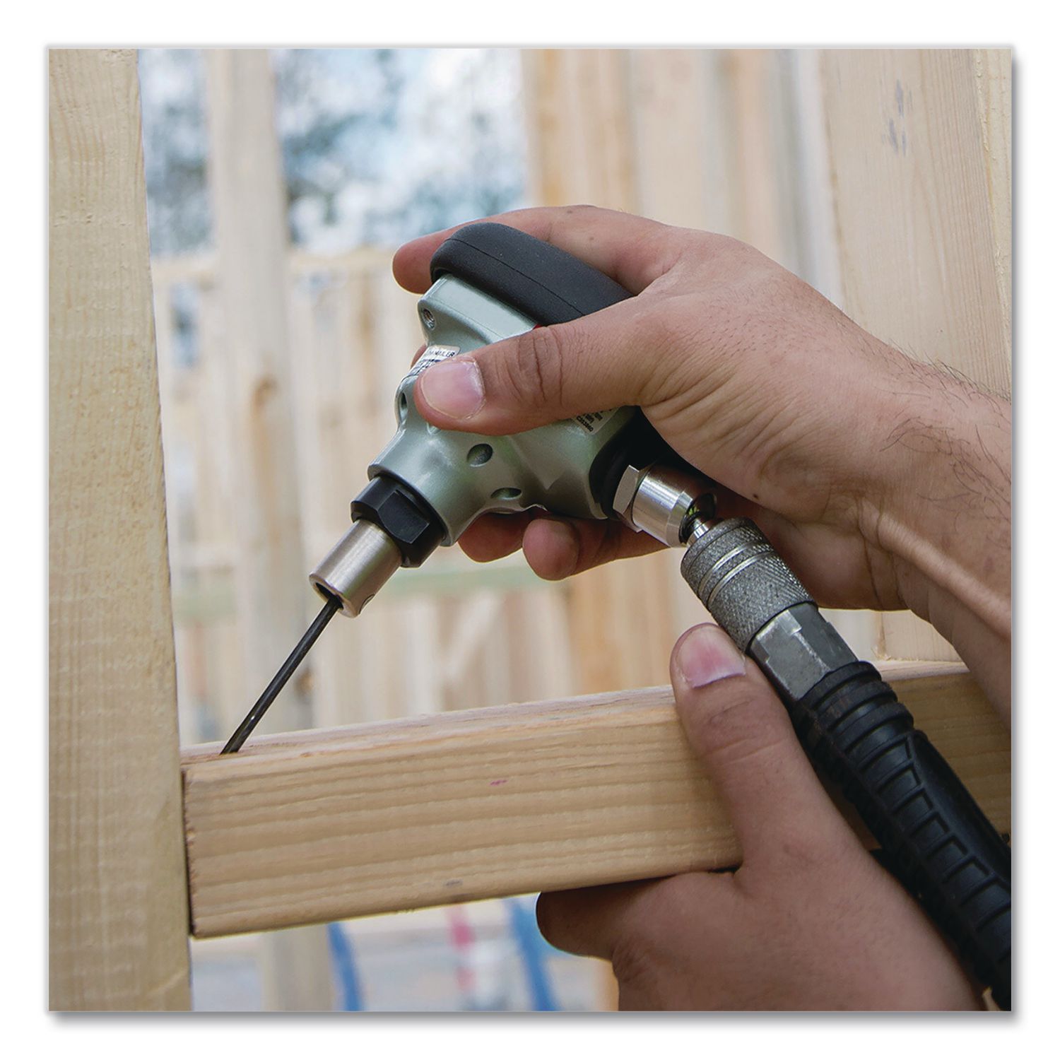 The 3.5″ Palm Nailer accepts a 2.5″ to 3.5″ bulk fastener, while offering superior maneuverability when working in confined areas. It is ideal for installing joist hangers and metal connectors. Its 360° swivel plug allows the hose to hang at any angle instead of straight-out adding convenience when working in tight spaces. The over-molded rubber grip provides comfort, absorbs vibration and improves control. Maximum Fastener Length: 3.5″; Fastener Type: Nails; Fastener Capacity: (1) Bulk; Operating Pressure (PSI): 80 to 100 PSI.