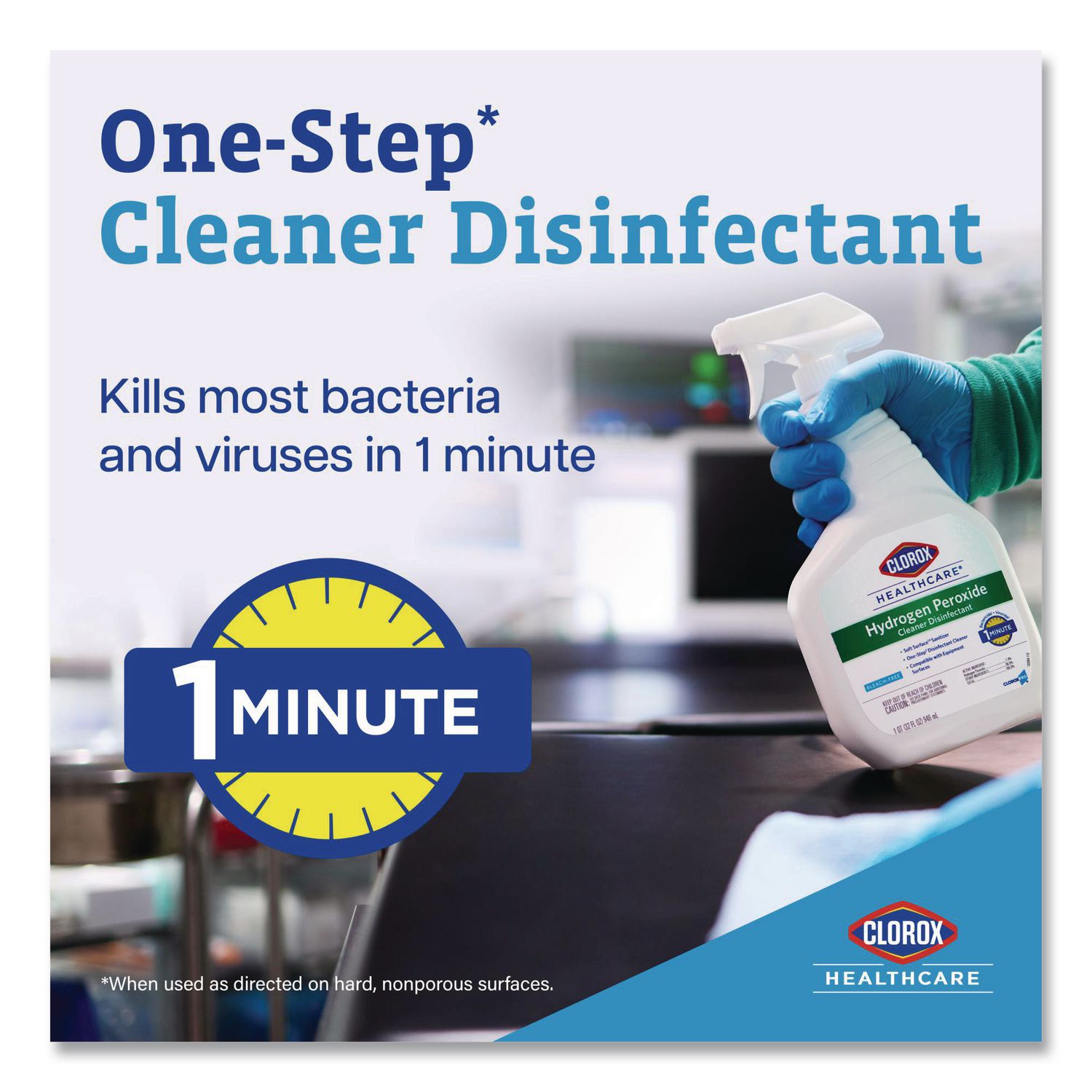 Great surface compatibility, low residue, fast kill times. Clorox Healthcare Hydrogen Peroxide Cleaner Disinfectant is EPA registered to kill over 40 microorganisms in one minute or less, including C. auris, VRE, CRE and MRSA. This disinfectant spray also kills biofilm bacteria including Klebsiella aerogenes, Staphylococcus aureus in two minutes. Clean using a non-corrosive disinfectant tested on medical devices and save time with a fast, non-bleach formula. Clorox hydrogen peroxide disinfectant is a bleach free sanitizer that is EPA registered to kill bacteria including Pseudomonas aeruginosa and Staphylococcus aureus on soft surfaces in 30 seconds. Use hydrogen peroxide disinfectant in hospitals, operating rooms, outpatient centers, emergency rooms and long-term care facilities. Use as directed on hard, nonporous surfaces. Application: Disinfectant/Cleaner; Applicable Material: Acrylic; Ceramics; Enamel; Fiberglass; Finished/Sealed Wood; Laminates; Metal; Plastic; Sealed/Engineered Stone; Vinyl; Chemical Compound: Hydrogen Peroxide; Dirt Types: Bacteria; Dust; Fungus; Germs; Grime; Mildew; Mold; Organic Matter; Viruses; Water-Based Soil.