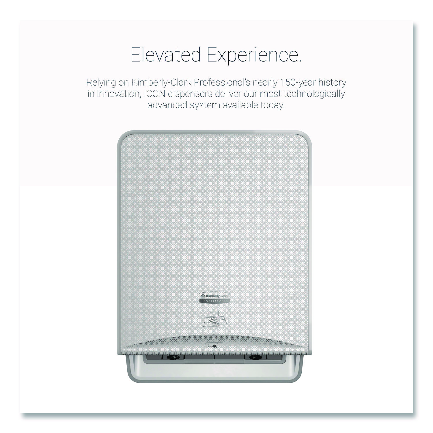 The Kimberly-Clark Professional™ ICON™ automatic paper towel dispensing system is our newest industry-leading innovation, changing the face of the restroom forever. Featuring first-of-a-kind versatility, the ICON™ paper towel dispenser effortlessly enhances the look of the restroom with an exclusive line of designer faceplates to help reimagine the restroom. Inspired by human-centered design, the ICON™ dispenser features an intuitive control panel, front-load battery bay and a dampened hinge feature. Using direct-drive technology the ICON™ dispenser features patented dual sensors that deliver worry-free, touchless 99.99% jam-free dispensing and is compatible with your choice of Kleenex® or Scott® roll towels. Engineered to help minimize the risk of spreading germs from every touchpoint. These gorgeous dispensers feature our interchangeable faceplate technology and complement the other ICON™ skin care and toilet paper dispensers in the collection. Towels Dispensers Type: Roll Towel Dispenser; Dispenser Capacity (text): One Roll; Material(s): ABS Plastic; Color(s): Silver Mosaic.