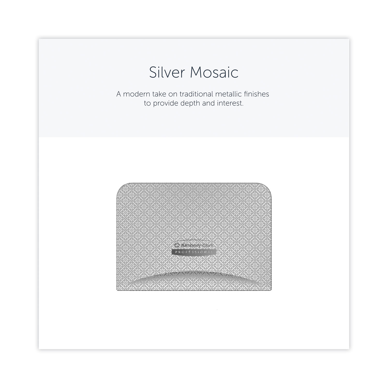 Reimagine the look and feel of your restroom with the ICON™ toilet paper dispenser’s quick and easy faceplate swap. Designed to take minimal effort, changing the faceplate is literally a snap in a few steps. Choose from six designer options. The range of contemporary classic faceplates offers a practical, yet modern take on traditional designs including a unique selection of faceplates designed to add a natural accent to your washroom environment. Vertical. Color(s): Silver Mosaic; Material(s): Plastic; Width: 4.25″; Depth: 6″.