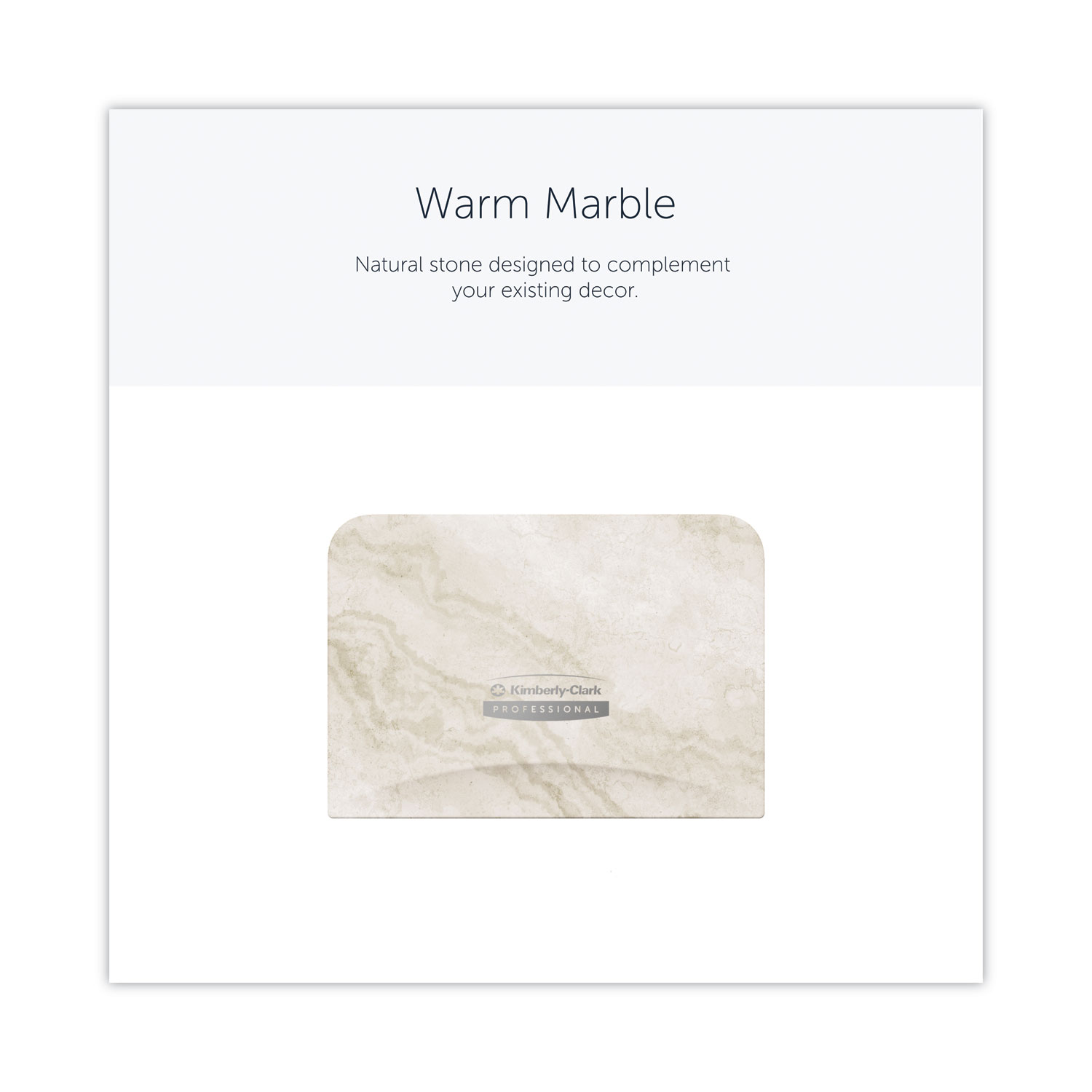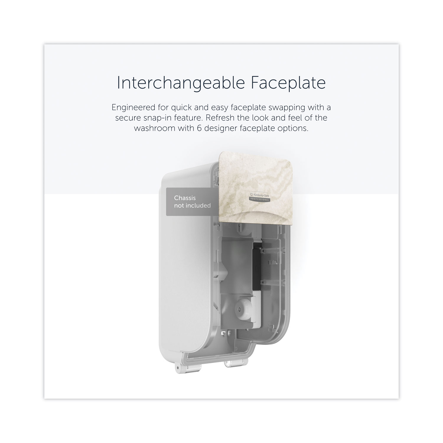Reimagine the look and feel of your restroom with the ICON™ toilet paper dispenser’s quick and easy faceplate swap. Designed to take minimal effort, changing the faceplate is literally a snap in a few steps. Choose from six designer options. The range of contemporary classic faceplates offers a practical, yet modern take on traditional designs including a unique selection of faceplates designed to add a natural accent to your washroom environment. Vertical. Color(s): Warm Marble; Material(s): Plastic; Width: 4.25″; Depth: 6″.