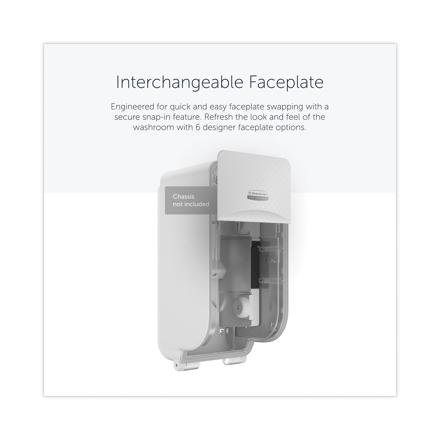 Reimagine the look and feel of your restroom with the ICON™ toilet paper dispenser’s quick and easy faceplate swap. Designed to take minimal effort, changing the faceplate is literally a snap in a few steps. Choose from six designer options. The range of contemporary classic faceplates offers a practical, yet modern take on traditional designs including a unique selection of faceplates designed to add a natural accent to your washroom environment. Vertical. Color(s): White Mosaic; Material(s): Plastic; Width: 4.25″; Depth: 6″.