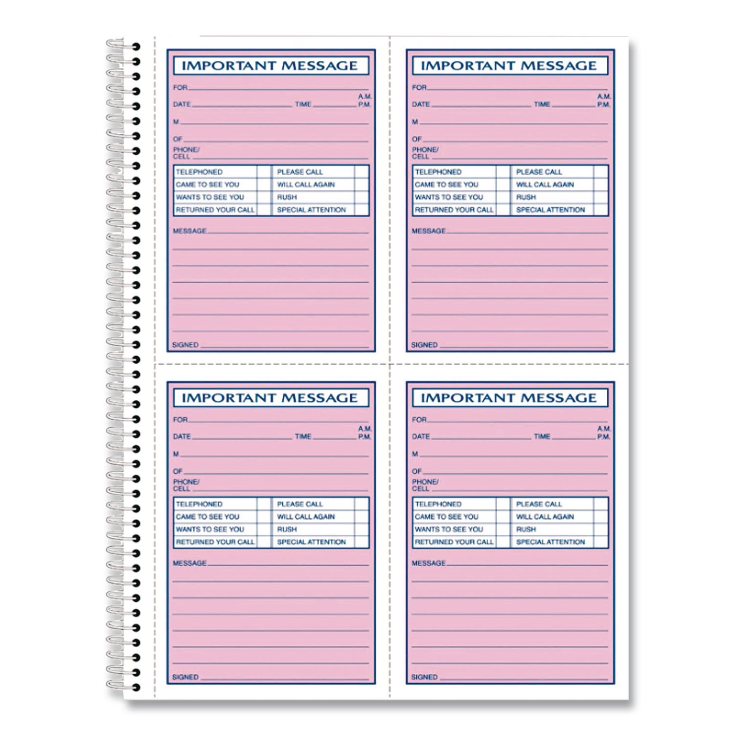Take note of important messages easily and efficiently with AdamsĀ® Important Message Book. Pre-formatted forms provide prompts for all the important details: intended recipient, date, time, comprehensive contact details, means of contact, action-requested, message-taker’s name as well as plenty of ruled space for the body of the message. Carbonless, multi-part format allows you to pass along priority messages and keep a copy in the book for administrative tasks. Spiral binding keeps the copies secure while allowing the book to lay flat when open. Form Type Details: Memo/Message; Dated: No; Forms Per Page: 4; Forms Per Page Layout: Horizontal/Vertical: Two Down, Two Across.