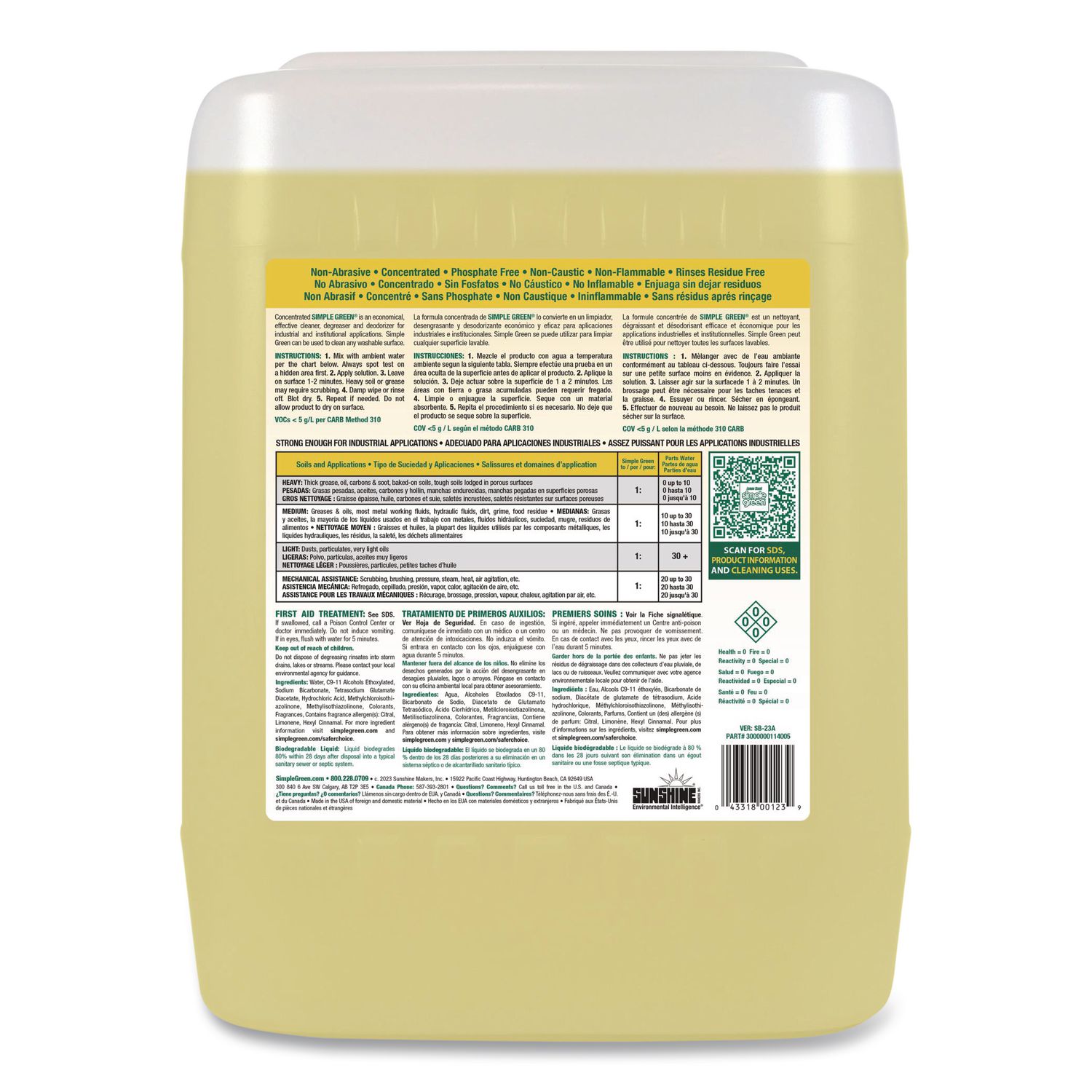 Simple Green® Industrial Cleaner and Degreaser provides a safer alternative to caustic or acidic cleaners, bleaches and solvents. The trusted formula is non-abrasive and recognized by the U.S. EPA’s Safer Choice Program. Designed to be used on all washable surfaces, Simple Green® powers away heavy dirt, grease, food residue and stains from countertops, sinks, tile, carpet, flooring, upholstery and more. The cost-effective concentrate can be used manually or in cleaning equipment such as such as floor scrubbers, dip tanks, carpet extractors, pressure washers, steam extractors and foamers. Easily cuts through tough grease, oils, cutting fluids and built-up grime on equipment, engines, machinery, vehicles and manufactured parts making it ideal for a wide range of industries including janitorial, manufacturing, MRO, food processing, mining, automotive, transportation and engineering. Application: Degreaser/Cleaner; Applicable Material: Carpet; Cement/Concrete; Ceramics; Enamel; Fabric; Fiberglass; Laminates; Metal; Plastic; Upholstery; Chemical Compound: Water-Based Non-Ionic Surfactant; Dirt Types: Grease; Grime; Lubricants; Oil-Based Soil.