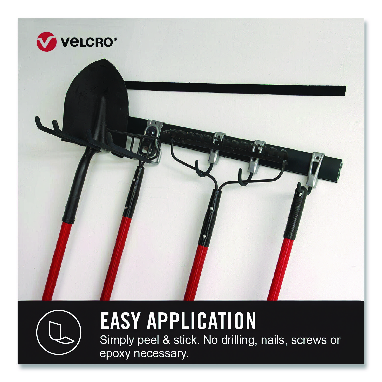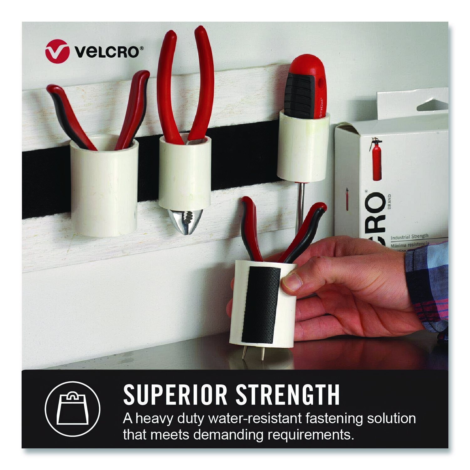Extra strong hook and loop fasteners hold up to 10 lbs. Waterproof adhesive. Ideal for indoor or outdoor use. Sticks to most surfaces, including plastic. Excellent for indoor or outdoor use where extra holding power is needed. Industrial-Strength. Hook and Loop Fastener Type: Adhesive-Backed Roll; Suggested Use: Indoor/Outdoor Heavy-Duty; Color(s): Black; Tape Pad Size: 2″ x 4 ft.
