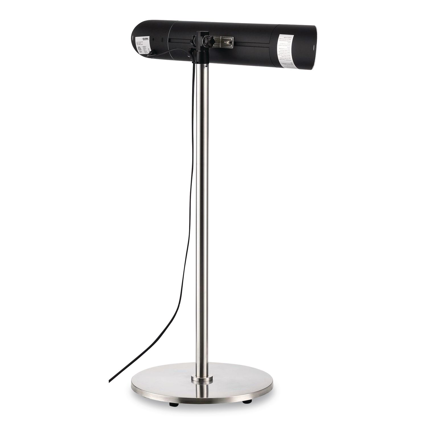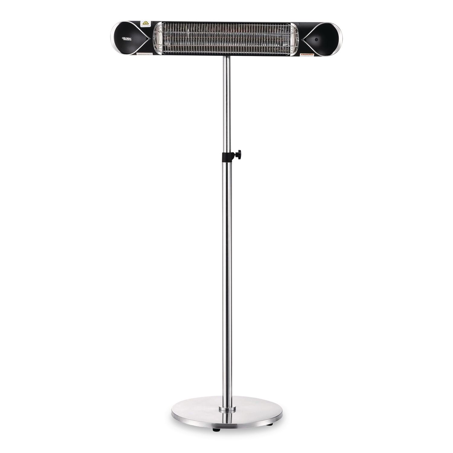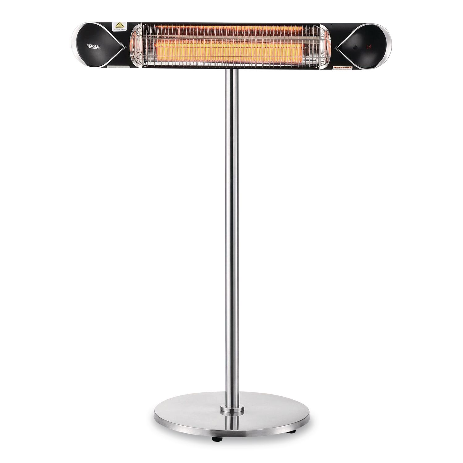 Keep your patrons comfortable well into the cooler months with this patio heater. The perfect complement to decks, patios, and other outdoor locations, this water-resistant heater offers the latest in infrared medium wave technology, enabling instant heating in as little as three seconds. Powered by a remote control, with four settings for customization, your guests will enjoy reliable comfort and warmth. Providing up to 250 sq ft in coverage, this energy-efficient heater features a carbon fiber lamp that emits soft, warm light, making the unit unobtrusive in a range of outdoor settings. The heater offers up to 90% heat efficiency for overall cost savings. IP55-rated to withstand dust and low-pressure water spray. Comes with a built-in safety device that protects the unit from overheating. Can be mounted to the wall or ceiling, or can be moved as needed with the included stand. Installation must be completed by a qualified technician. Heater Type: Infrared Heater; Safety Features: Overheat Protection; Setting Range [Min]: 375 W; Setting Range [Max]: 1,500 W.