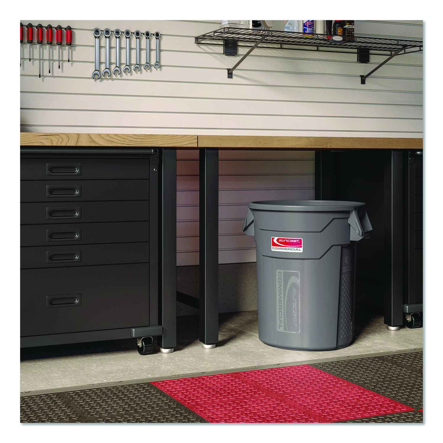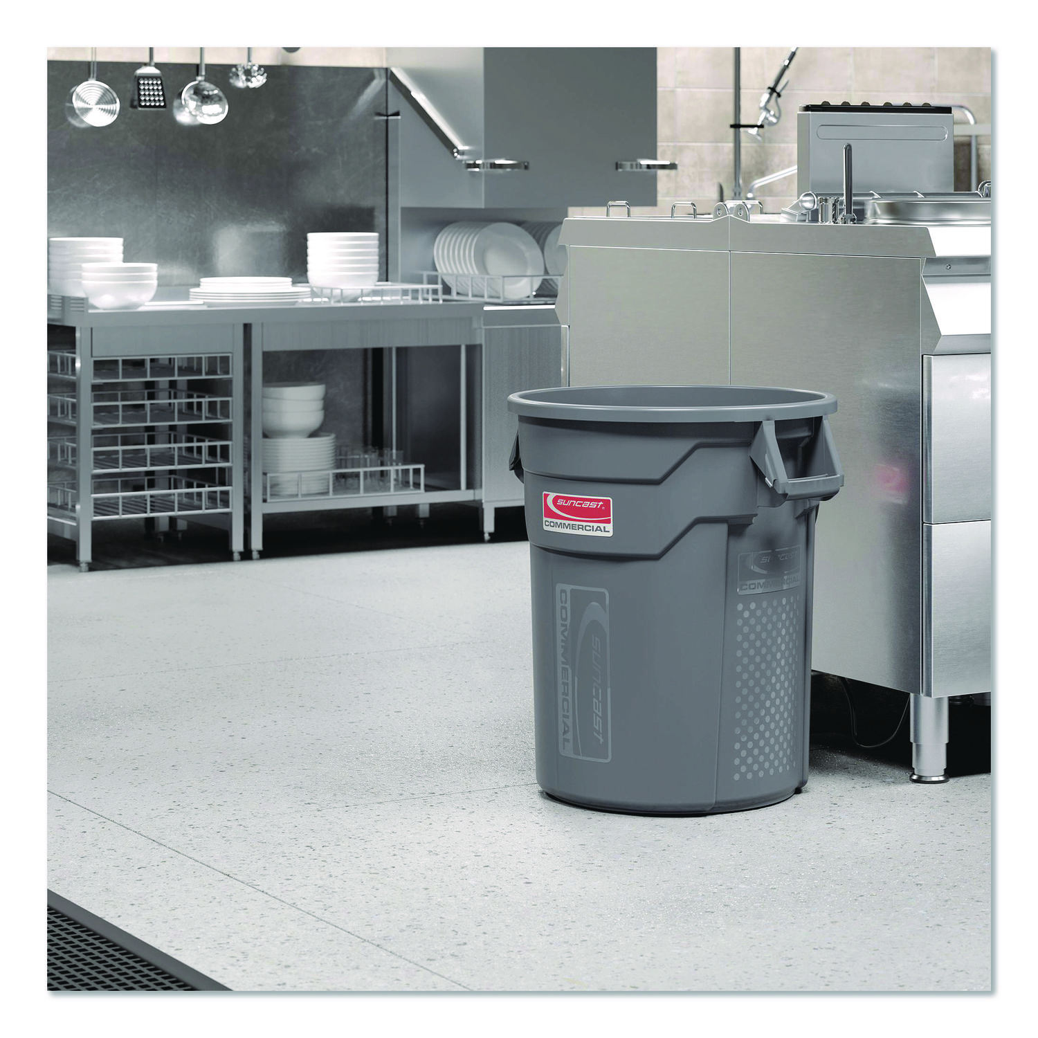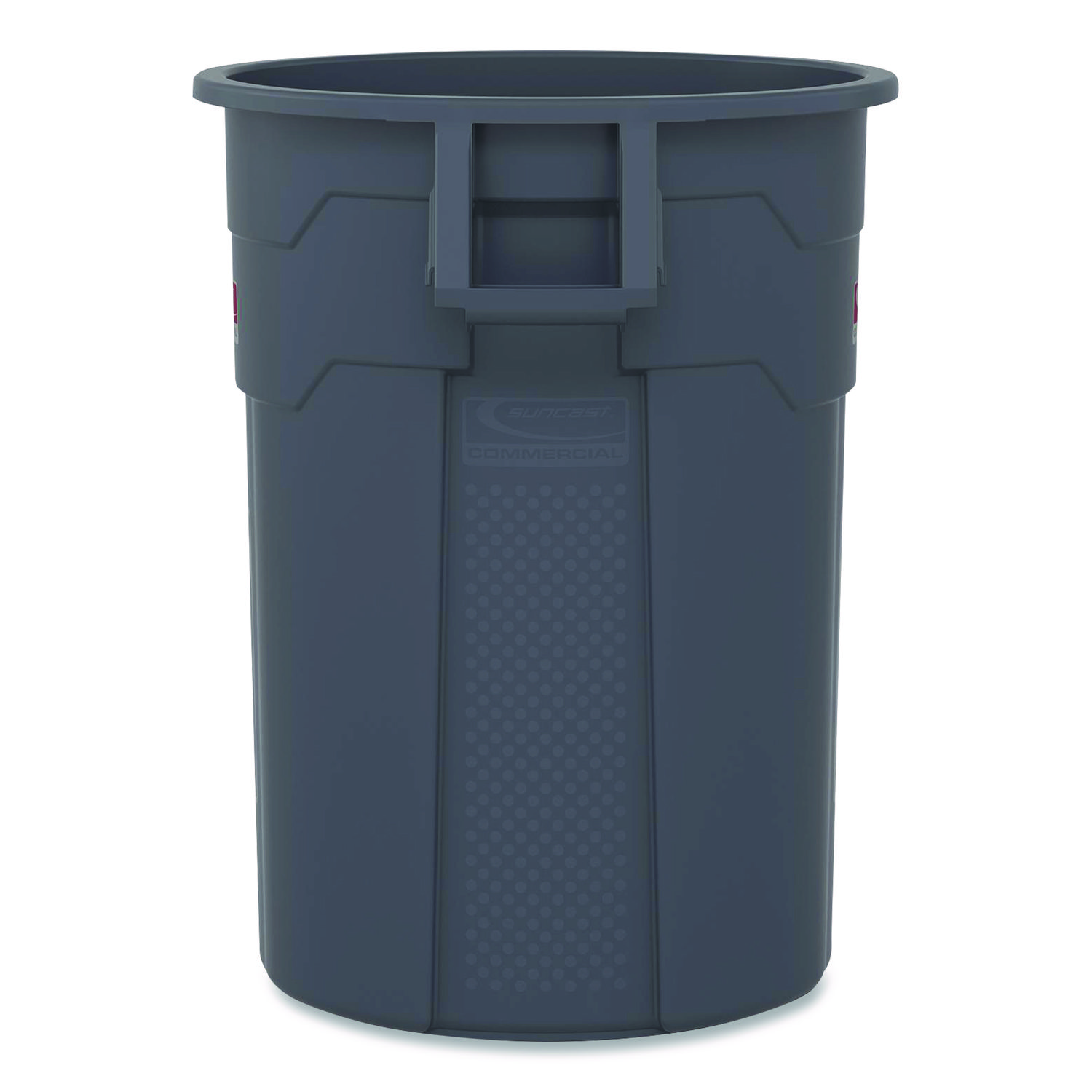 The Suncast Commercial® injection molded utility trash can is manufactured to last longer and be more durable than competing cans. This trash can will not rust and is resistant to denting and bending. The vented channels aid in reducing the force required to remove a filled can liner, while the side handles allow for an effortless lifting and easy transportation. Waste Receptacle Type: Indoor All-Purpose Waste Bin; Material(s): Resin; Application: Indoor All-Purpose Waste Disposal; Interior Volume Capacity: 20 gal.