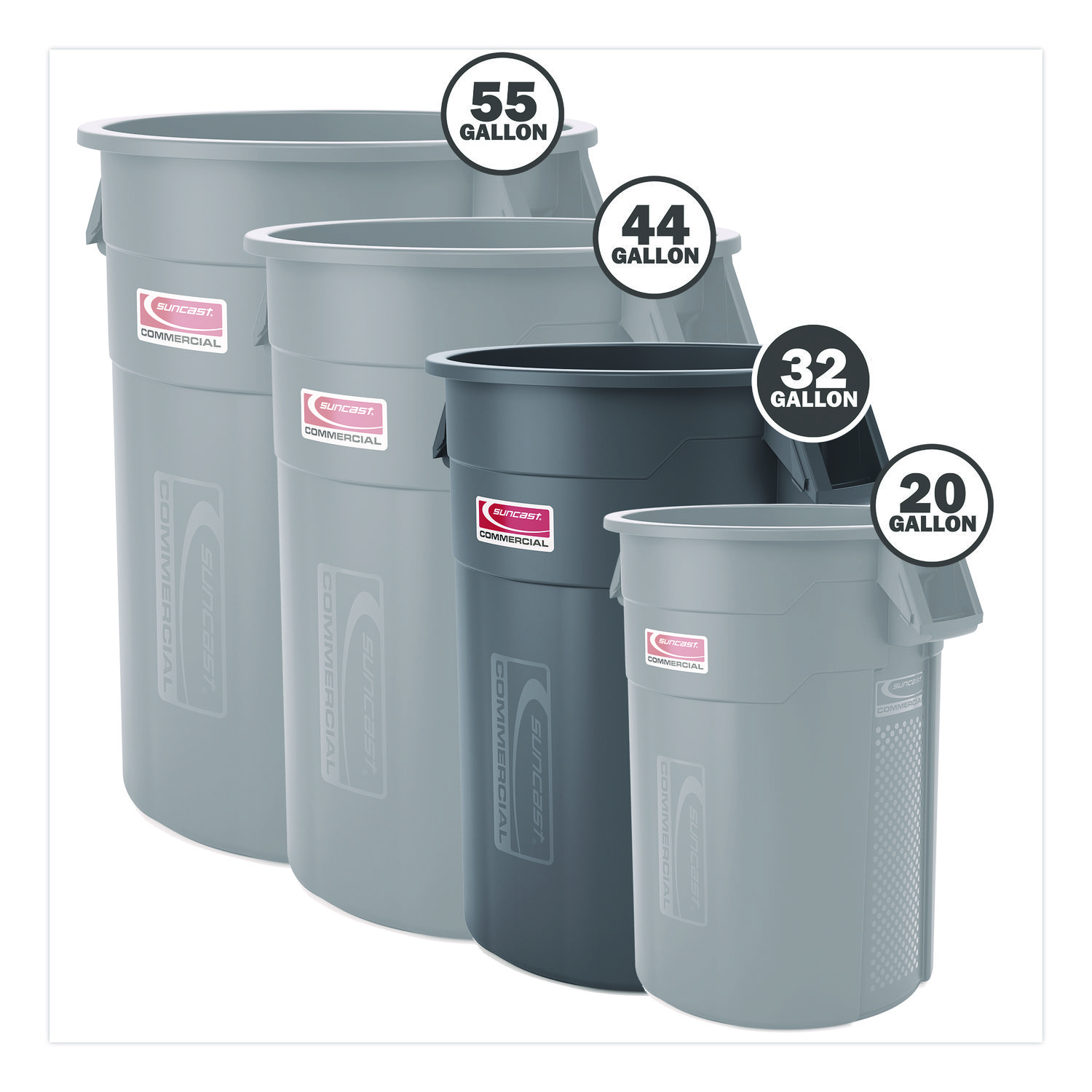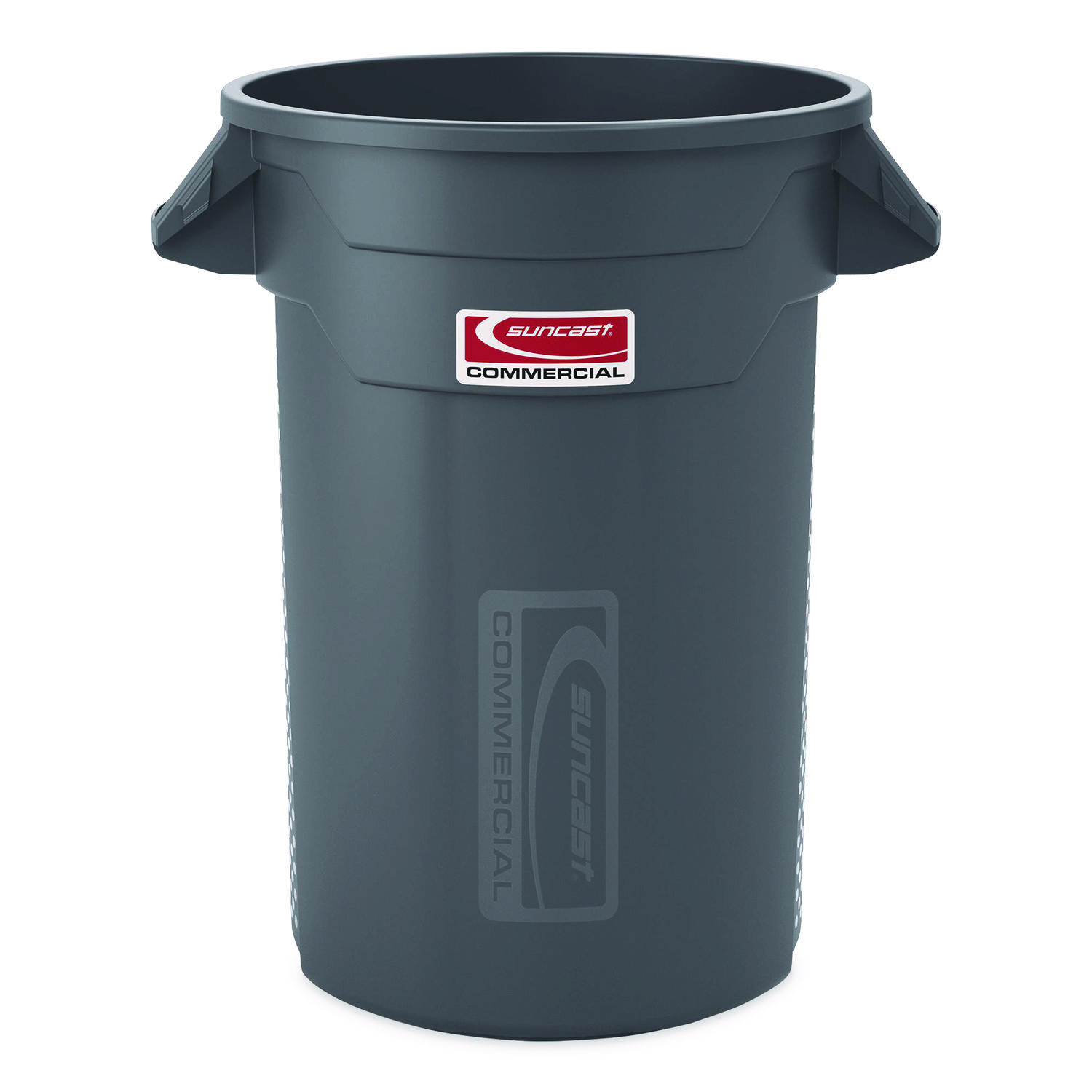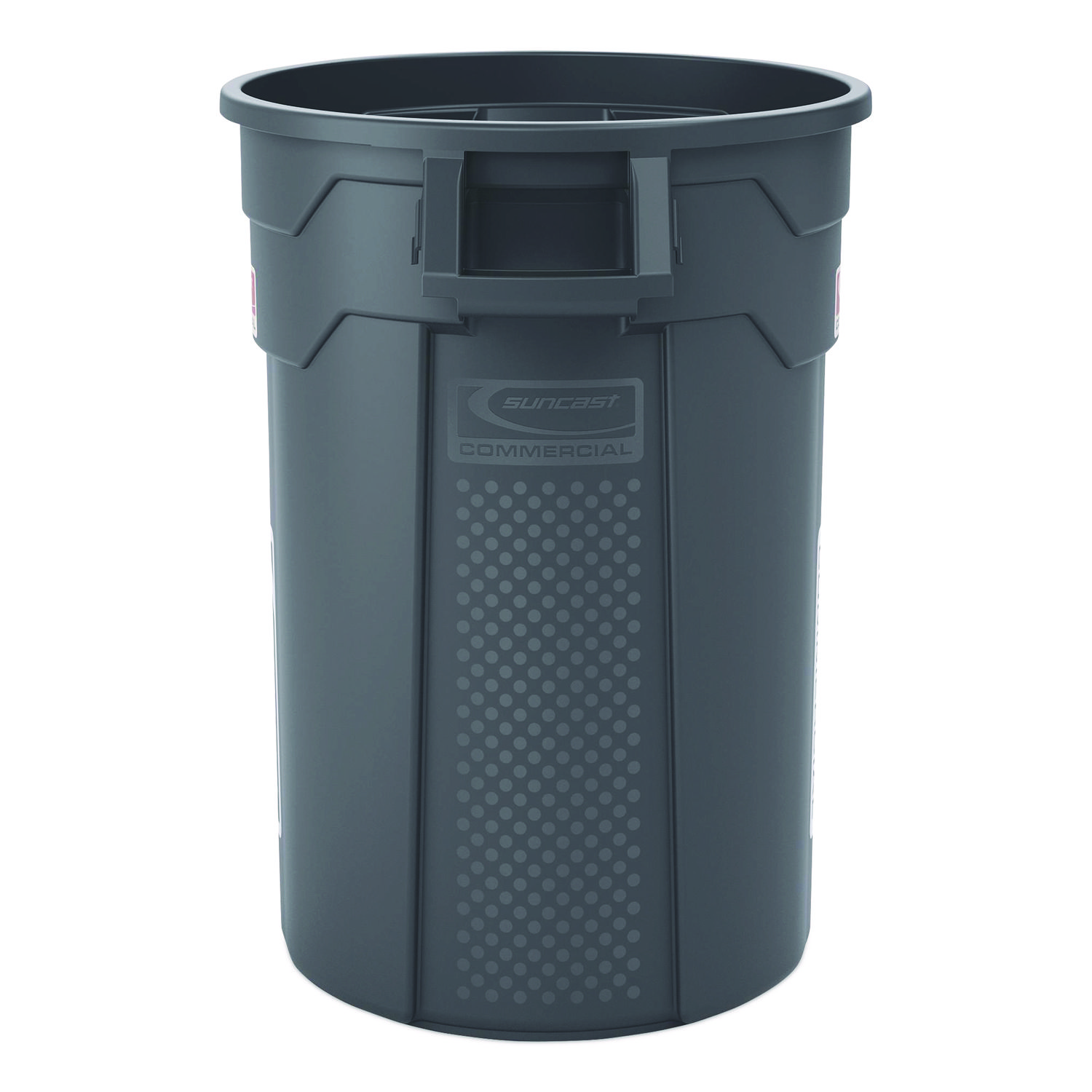 The Suncast Commercial® injection molded utility trash can is manufactured to last longer and be more durable than competing cans. This trash can will not rust and is resistant to denting and bending. The vented channels aid in reducing the force required to remove a filled can liner, while the side handles allow for an effortless lifting and easy transportation. Waste Receptacle Type: Indoor All-Purpose Waste Bin; Material(s): Plastic; Resin; Application: Indoor All-Purpose Waste Disposal; Interior Volume Capacity: 32 gal.