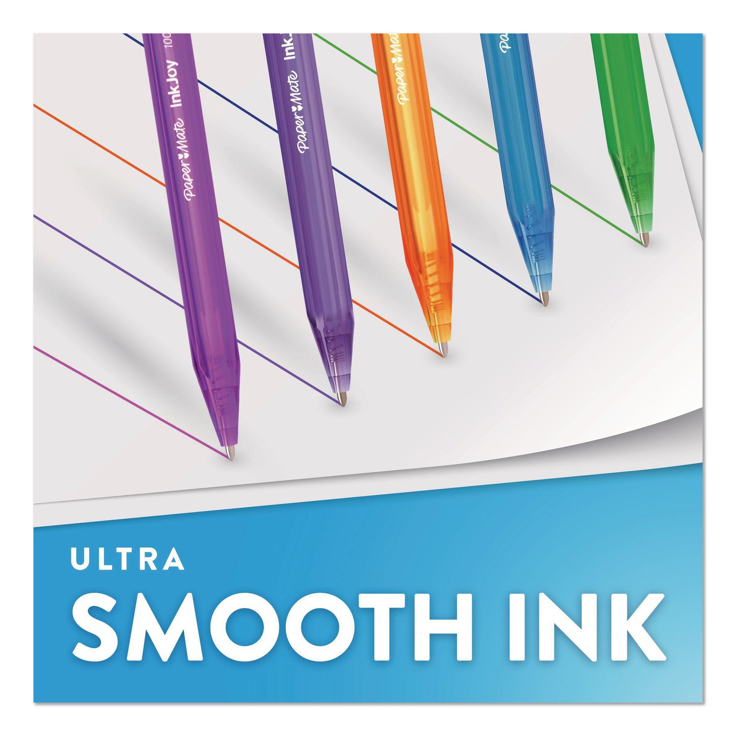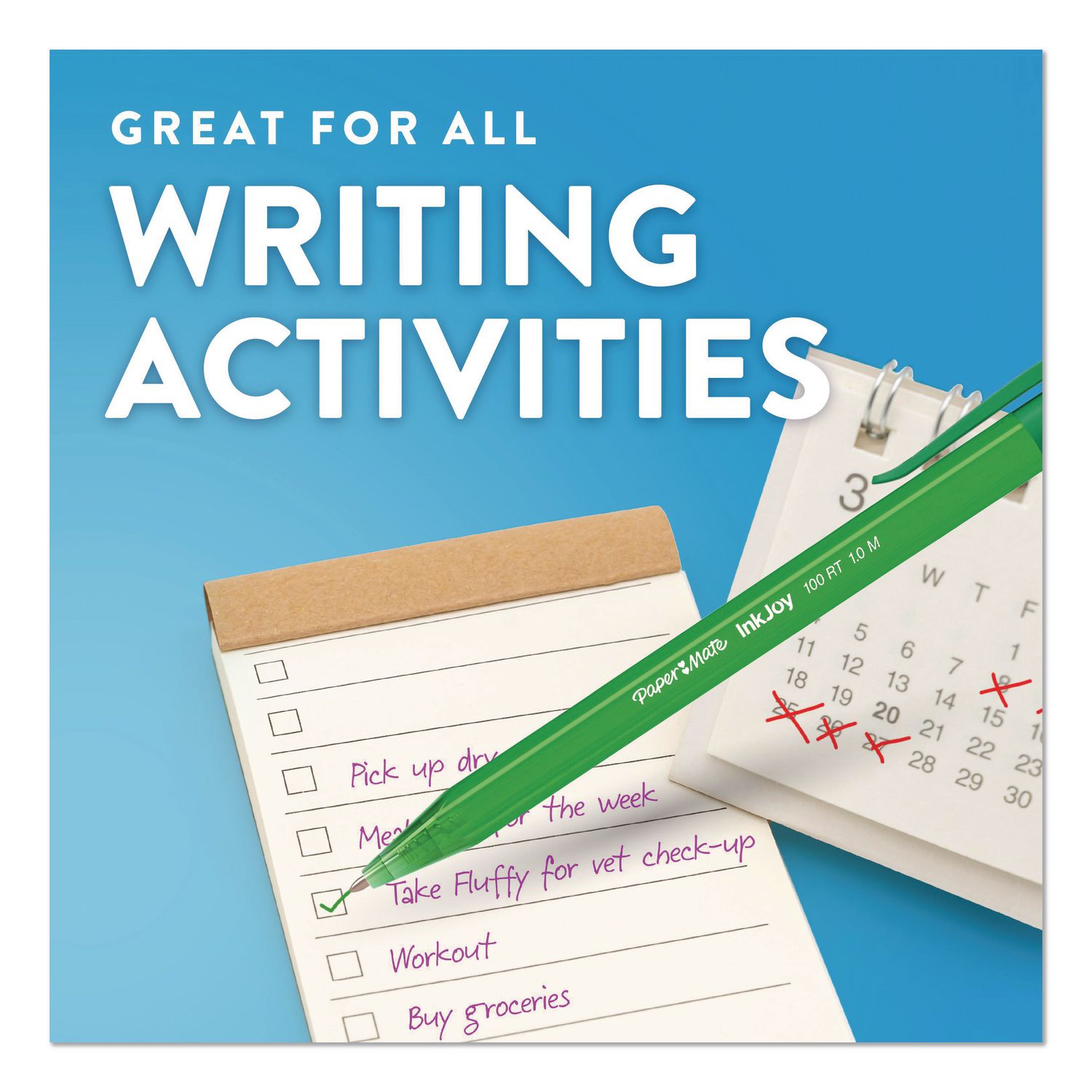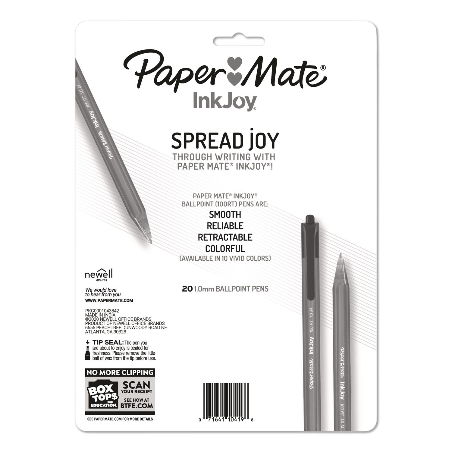 Spread joy with InkJoy and brighten up every page with ink that flows as freely as your thoughts. Paper MateĀ® InkJoy 100 RT Retractable Ballpoint Pens feature a smooth, fast-starting writing system that spreads ink easily, so writing’s never a drag. Even work and school can be fun when you have one of these vividly colored pens. Pen Sub-Brand & Product Family: InkJoy 100 RT; Pen Type: Ballpoint Pen; Pen Style: Retractable; Pen Tip Type: Conical.