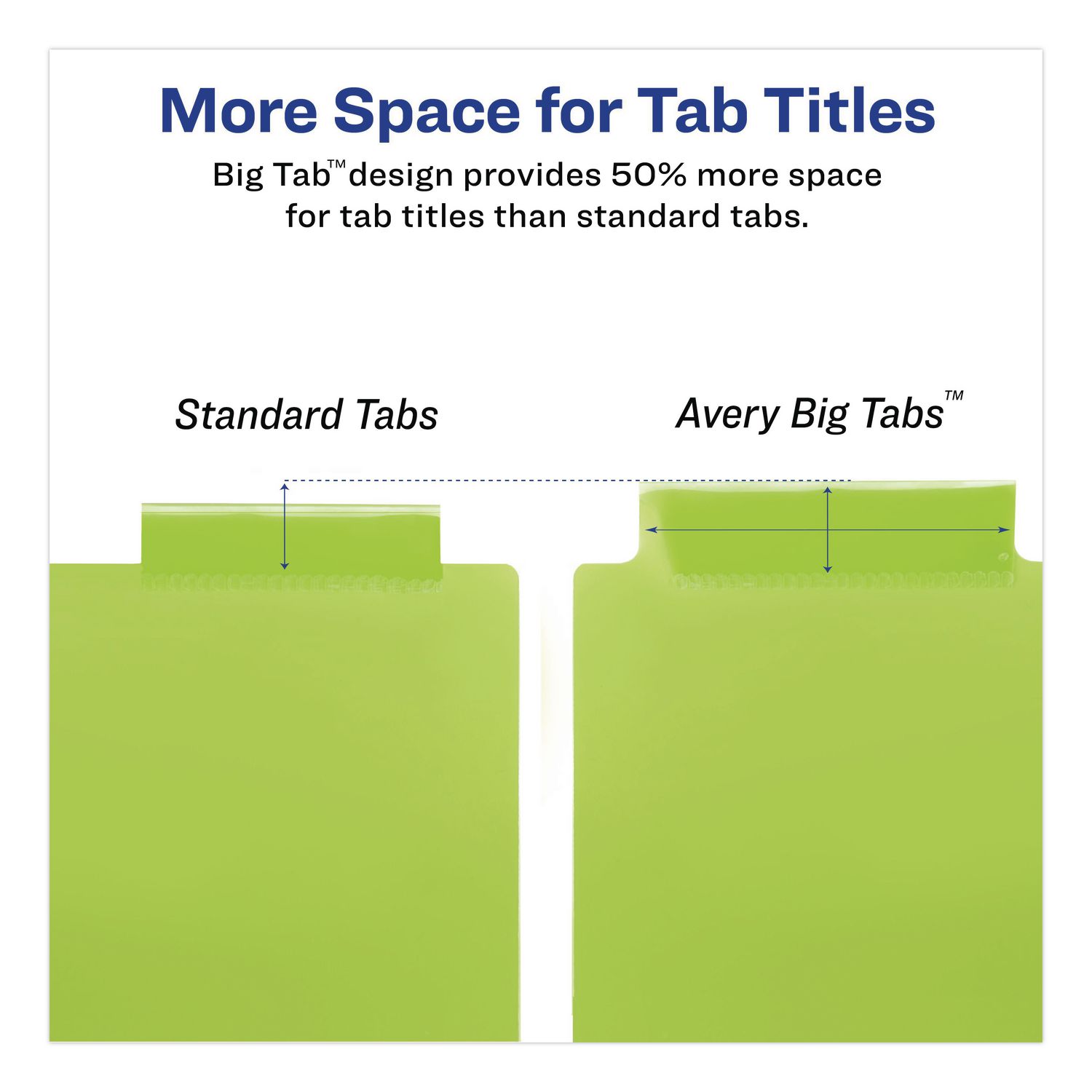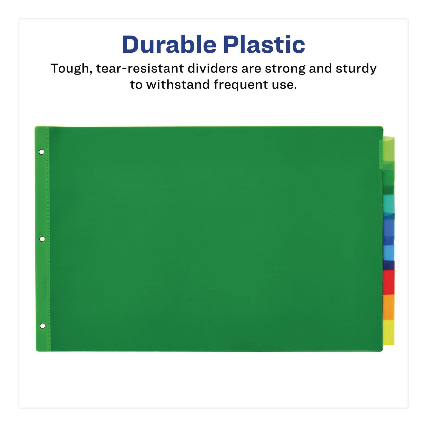Thinking big? Then these tabloid-size Big Tab™ Insertable Plastic Dividers offer eye-catching multicolor tabs providing 50% more writing space than standard tabs for convenience you can see. The tabs feature a secure indent point that keeps inserts from falling out. Larger tabs allow you to use big fonts or more lines of text for tabs that are informative and easy to read. Create your own professional tabs with templates from Avery Design & Print. Keep your projects organized and in order with larger-than-life dividers. Handwrite or print inserts (compatible with laser and inkjet printers). Index Divider Style: Customizable; Index Divider Size: 11 x 17; Punched/Unpunched: 3-Hole Punched; For Use With: Ring Binders.