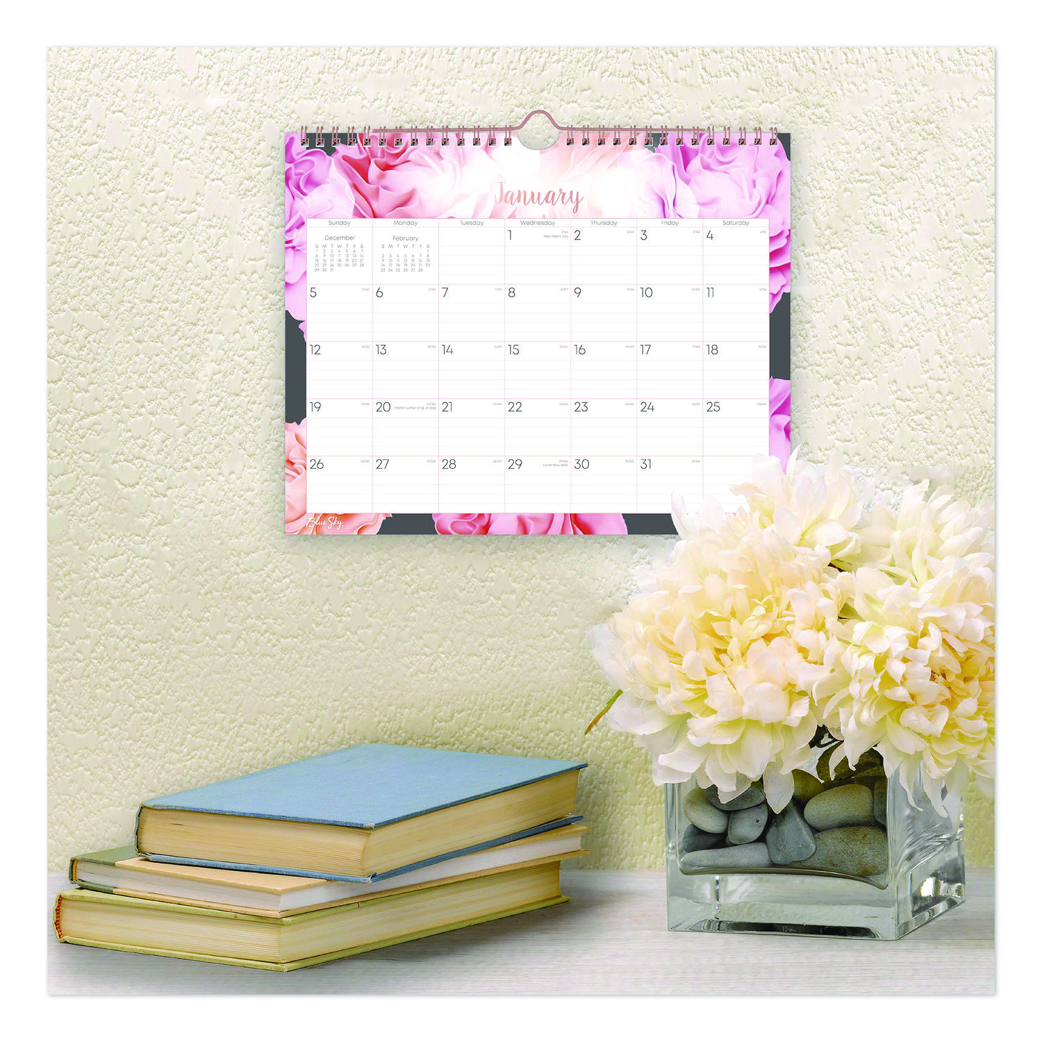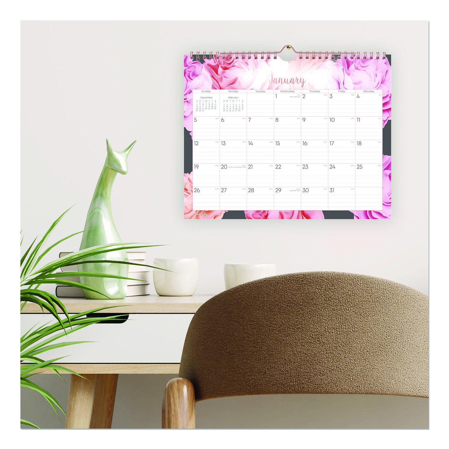 With elegant florals to accent any room, the Blue Sky® Joselyn Monthly Wall Calendar is perfect for tracking deadlines, birthdays and special events. Each month features large-font dates, plenty of space for daily notations, a count of days-past/days-remaining, all major holidays labeled and reference calendars to keep you on track. High-quality paper reduces the potential for ink-bleed. Printed using soy-based inks. Polished metal twin-wire binding with matching wall-hang loop. Dated: Yes; Academic Year: No; Calendar Format: Monthly; Calendar Spread Format: One Month per Page.