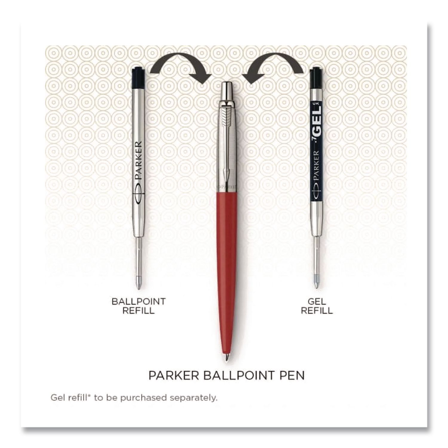 Slow down and appreciate the experience of expressing your thoughts on paper with the Parker® Jotter® Retractable Ballpoint Pen. A style icon for over 60 years, Jotter® has a streamlined design with rich metallic barrels, high-shine trims and iconic arrowhead clips. With covetable colors and a distinctive shape, Jotter® remains Parker’s most popular pen, recognizable down to its signature click. Stunning to behold, these pens make a wonderful gift for anyone who appreciates the art of fine writing. Pen Sub-Brand & Product Family: Jotter®; Pen Type: Ballpoint Pen; Pen Style: Retractable; Pen Tip Type: Conical.