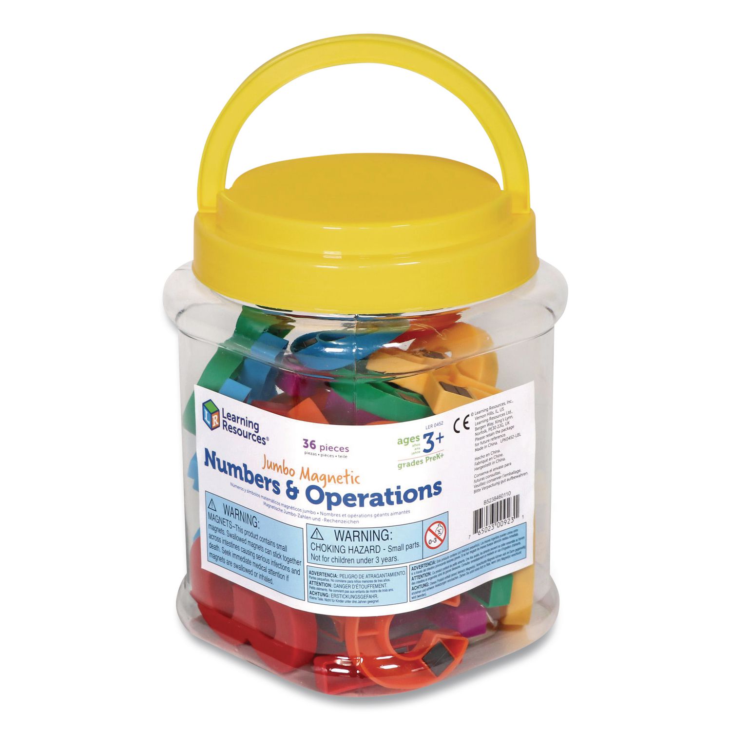 Practice number recognition, order and simple equations with jumbo magnetic numbers that every student will love. These durable, plastic numbers are brightly colored and big—easy for little hands to handle. Set includes 30 numbers and six operation symbols in six colors and plastic storage tub. 36 Pieces. Character Types: Numbers; Math/Money Symbols; Character Mounting Type: Magnets; Number of Pieces: 36; Character Color: Assorted.
