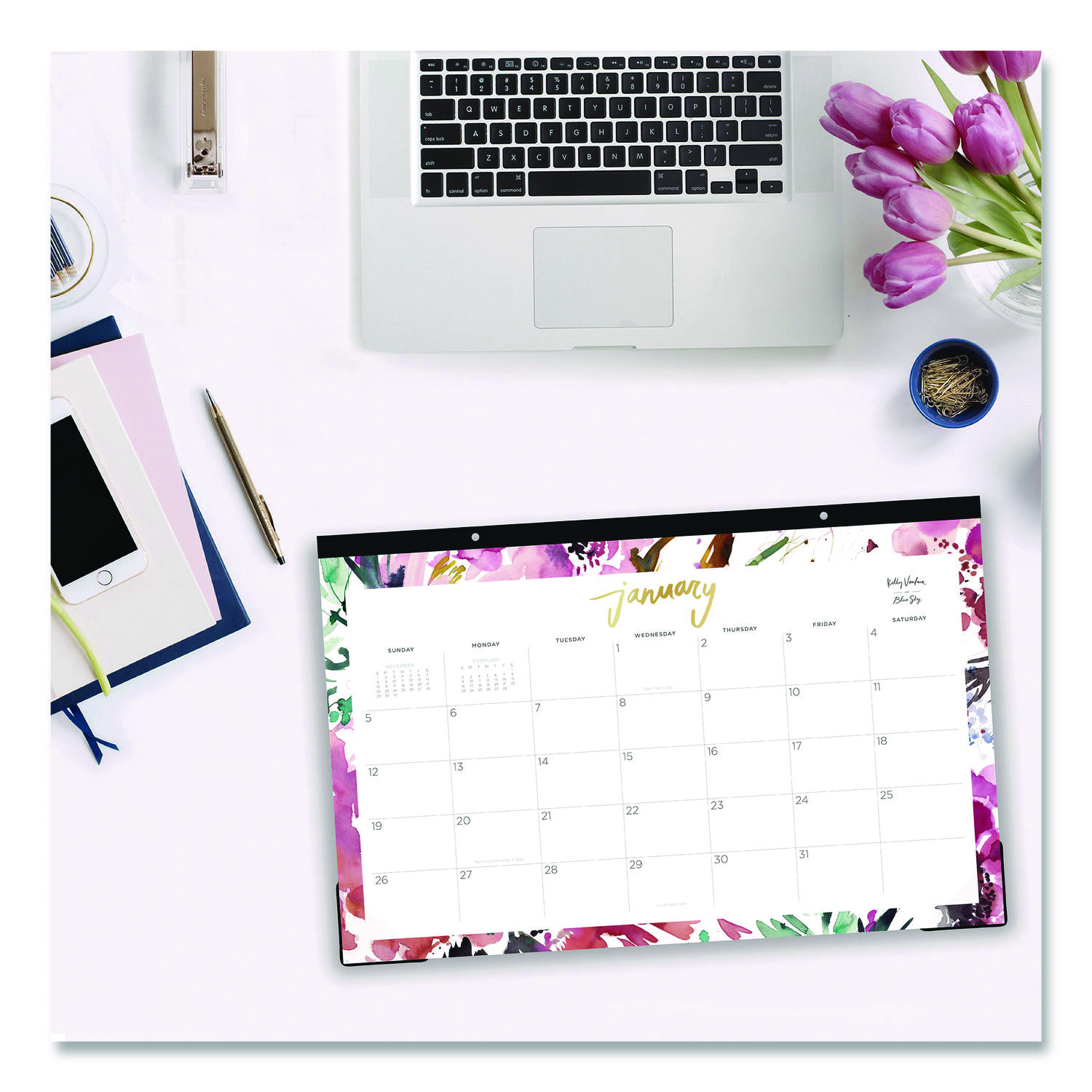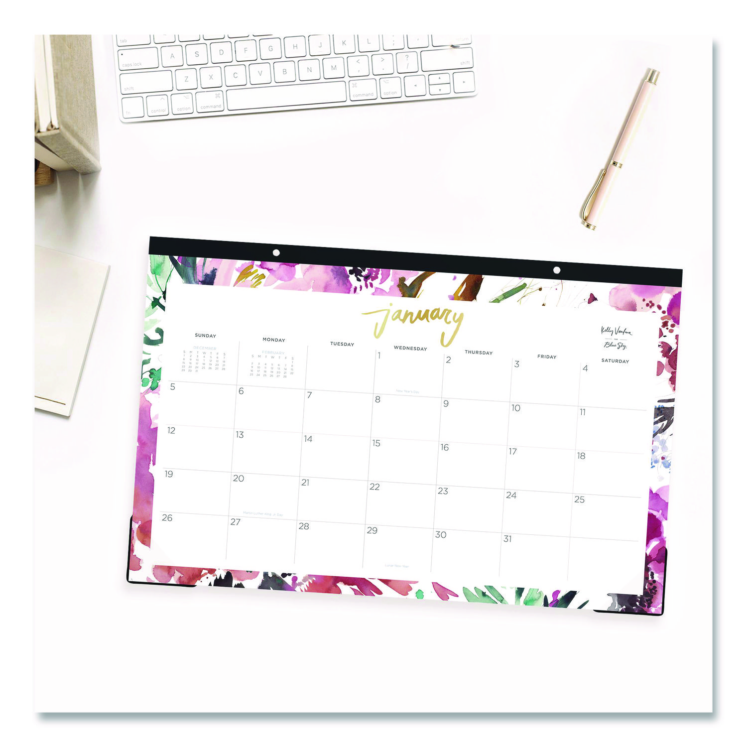 Few people can capture the beauty of planning like Kelly Ventura, so let your year bloom with one of her desk pad calendars. A lovely Magenta Bloom floral design calms while helping to inspire a feeling of wistful creativity. Each month is listed in gold-tone foil, while large-font dates, plenty of space for daily notations, a count of days-past/days-remaining, all major holidays labeled and monthly reference calendars help you stay on top of what’s to come. Sturdy backboard provides a cushioned writing surface, and clear corners keep each page flat. High-quality paper reduces the potential for ink bleed through. Dated: Yes; Academic Year: No; Calendar Format: Monthly; Calendar Spread Format: One Month per Page.