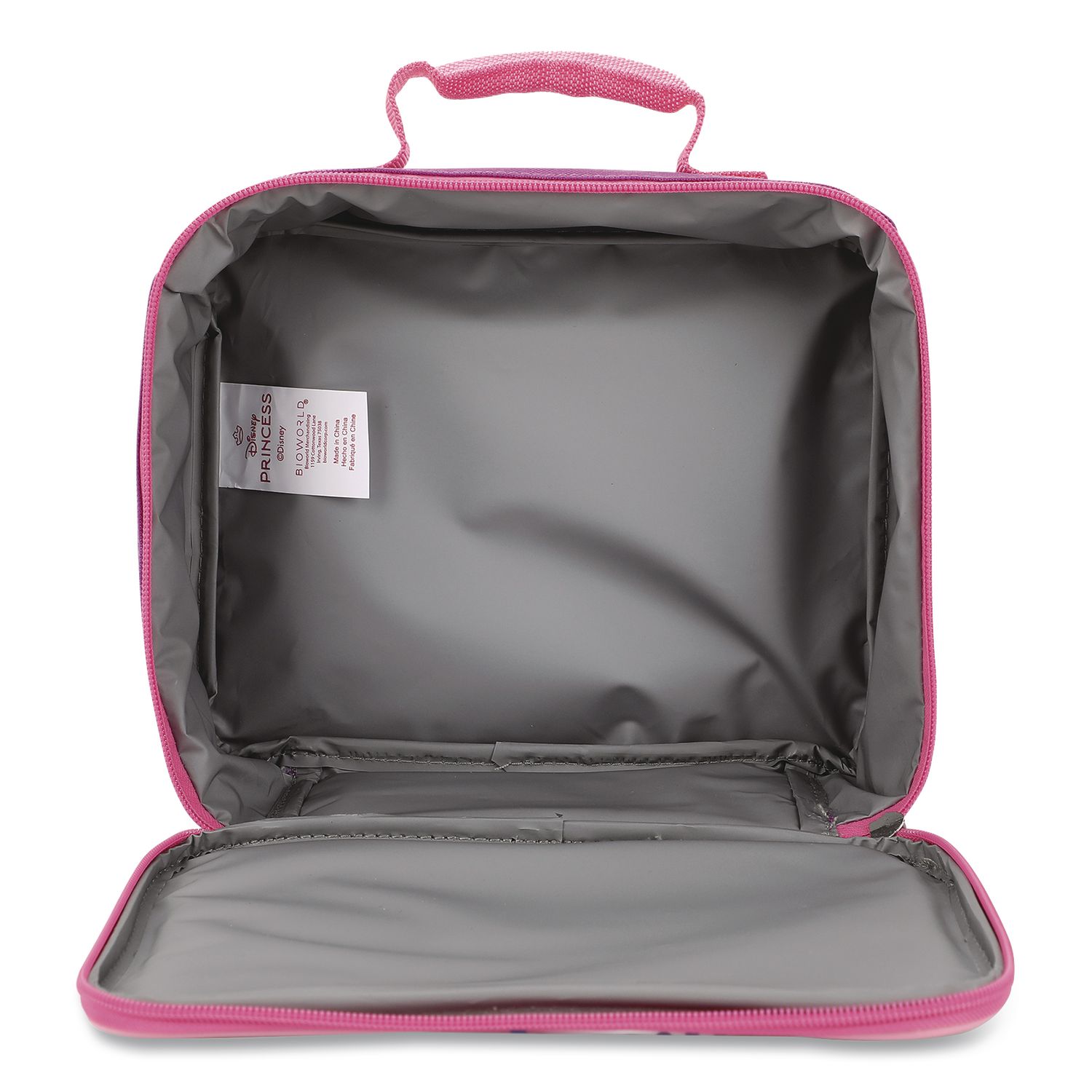 Make lunchtime magical with the Bioworld® Kids Insulated Lunch Tote! Whether it’s a warm meal or a cool sandwich, its spacious, insulated main compartment keeps your child’s favorite foods fresh and tasty, while its pull-tab zipper ensures it’s always easy for their small hands to open. Great for young ones on the go, its adorable exterior is also constructed of durable, water- and stain-resistant, easy-to-clean materials—just wipe it down with a damp cloth as needed. Disney Princesses Theme—Belle, Moana, Ariel, Mulan, Cinderella, Jasmine, Aurora and Tiana set against a shimmering pink and purple background. Color(s): Multicolor; Color Family: Multicolor; Material(s): Nylon; Carrying Handle: Yes.
