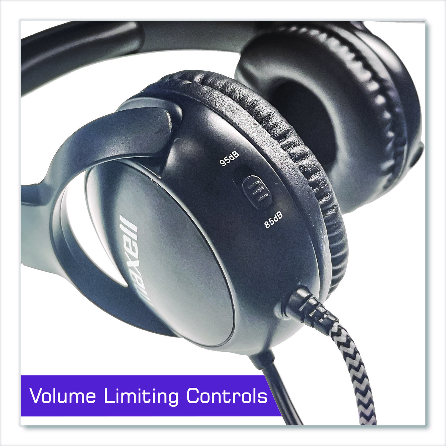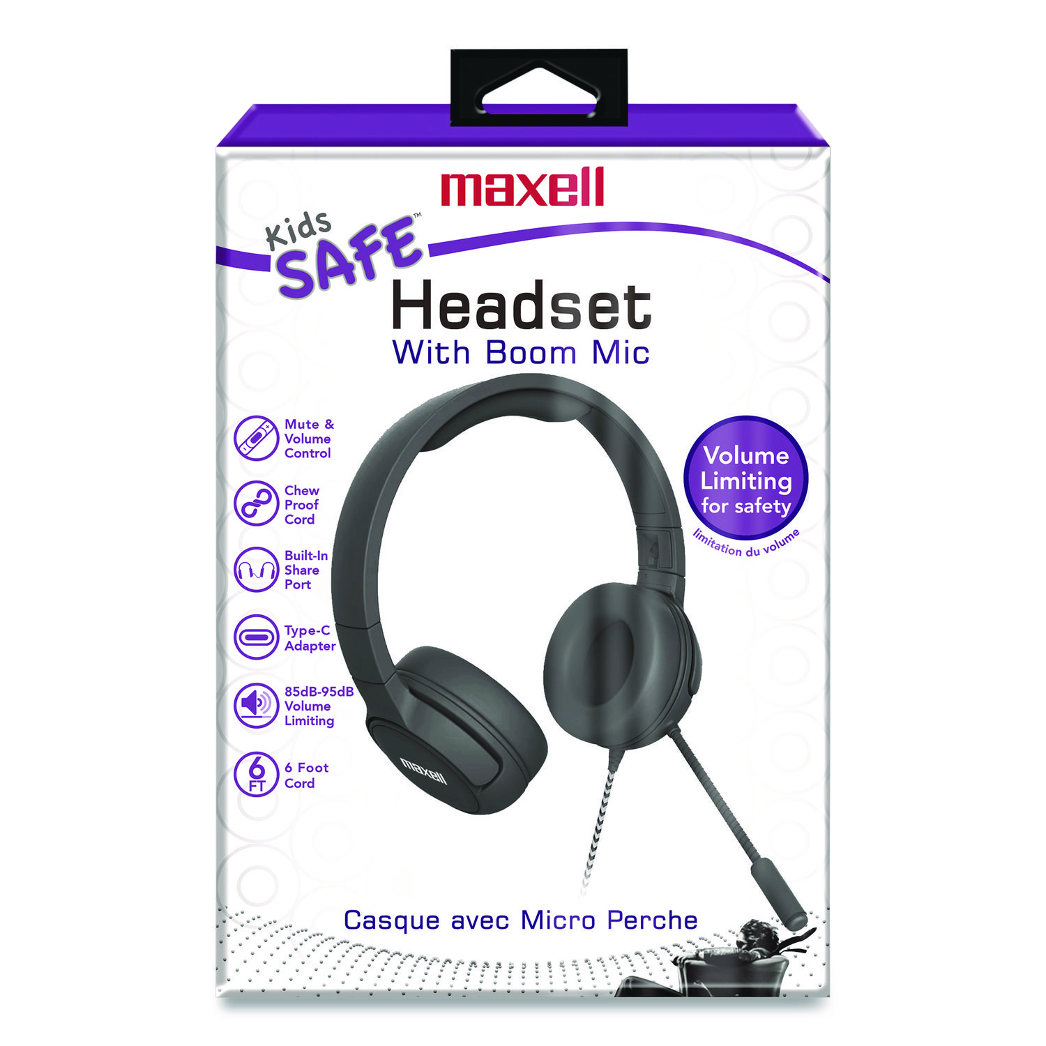 Maxell Kids Safe volume limiting wired headphone with boom style microphone features a 95 dB maximum safe listening level. The attached, flexible boom microphone provides improved communication, especially in louder environments. Full cup earpiece blocks background noise. Features a flexible headphone and chew-proof, extended length 6 ft cord. The Maxell Kids Safe Headphone comes with attached 3.5 mm plug and also includes a USB-C adapter for added connectivity flexibility. This headphone is feature-heavy with mute and volume control, as well as a built-in share port which allows two headphones to connect together and listen from the same audio source. Package also includes a resealable and easy-label plastic storage bag. Earpiece Type: Ear Cushions; Earpiece Material: Foam; Microphone (Yes/No): Yes; Headset Features: Boom Microphone; Twistable Headphone.