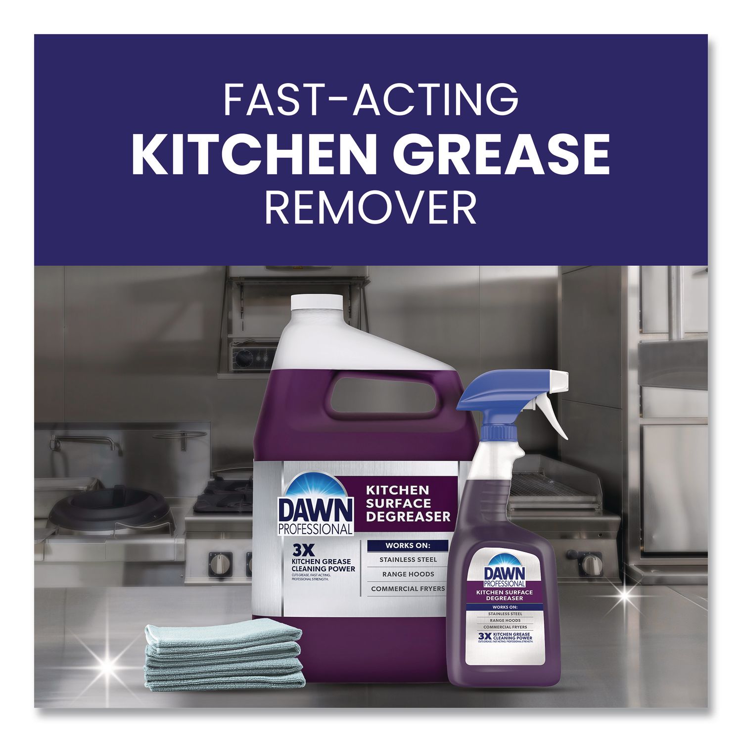 Dawn® Professional Kitchen Surface Degreaser is powerful on the toughest oil and grease found in commercial kitchens to clean range hoods, stoves and ovens, stainless steel surfaces, commercial fryers and more. It is also suitable to clean commercial kitchen surfaces such as backsplashes and counters. Application: Degreaser/Cleaner; Applicable Material: Corral Area,Drive-Thru Pads,Dumpsters,Fryers,Hard Surfaces,Ovens,Parking Lots,Range Hoods,Sidewalks,Walls; Chemical Compound: Water; Sodium Lauryl Sulfate; Lauramine Oxide; Sodium Laureth Sulfate; Denatured Alcohol; Phenoxyethanol; Sodium Chloride; PPG-26; PEG-8 Propylheptyl Ether; Methylisothiazolinone; Fragrance; Yellow 5; Blue 1; Dirt Types: Greasy Soils; Heavy Cooking Grease/Oil; Polyerized Animal Grease.