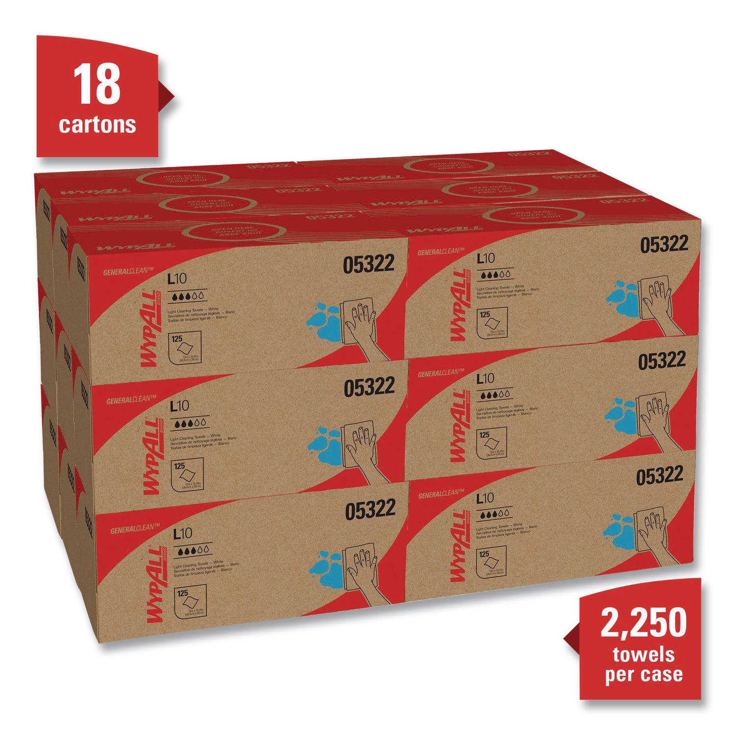 WypAll® is the number one brand of disposable wipes in the US and Canada. Create a clean work environment with light-duty general cleaning solutions. When you need a light-duty towel to deliver results at an economical price, WypAll® GeneralClean™ L10 light cleaning towels are a great choice. They are great replacement cleaning towels for spray-and-wipe jobs, glass surface cleaning, absorbing small liquid spills, detail and final assembly wiping. You’ll find these disposable towels in hospitality housekeeping, retail cleaning and general light-duty cleaning pursuits. Since these towels offer better drying performance than paper towels, you get better drying performance that can reduce usage overall. WypAll® GeneralClean™ L10 light cleaning towels are a terrific, reliable replacement for paper towels and can add efficiency to your business. These towels meet EPA guidelines for recycled fiber content. They’re a trusted tool to help you get the job done right. Pop-Up* Box. Towel/Wipe Type: Dry Wipes; Applicable Material: Glass; Machinery; Material(s): Paper; Number of Plies: 1.