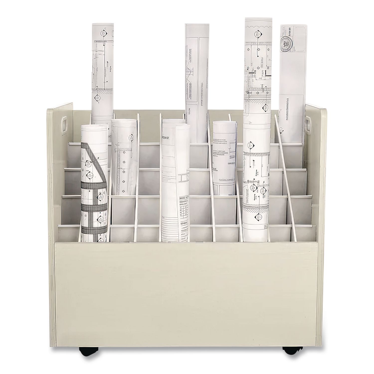 Simple and effective, the Safco Mobile Roll File helps you organize your rolled up documents, plans, posters, paper, proofs, blueprints and maps into tidy rows for easier visibility and access around your home, office or classroom. Slot your rolled up documents or tube-style blueprint holders into the 2.75″-square compartments of the Safco Mobile Roll File to keep them organized and readily available. The Mobile Roll File’s tiered, grandstand-style arrangement of its compartments accommodates rolls of different lengths and helps keep them separated enough so that you can both see and access each with greater ease. Easily maneuver the Mobile Roll File around your immediate workspace on its four 2″ pivoting wheels to help keep your rolled up reference documents and materials closer to where you’re actually working, so they’re always within reach. Featuring a robust furniture grade particleboard shell with a durable textured vinyl laminate finish, the Mobile Roll File’s sturdy cardboard dividers with plastic supports help keep your important rolled files neat and orderly. And it’s not just for engineering and architecture, either. Safco’s Mobile Roll File can also help tackle the tall task of wrangling your holiday wrapping paper collection at home or putting the packing supplies in proper order in your office mailroom – even use them in the classroom to keep maps and reference charts organized and easily accessible. Compartment Depths—Range from 12″ in the front row to 20.75″ in the back row. Color(s): Putty; Number of Compartments: 50; Compartment Size: 2.75 x 2.75; Overall Width: 30.25″.