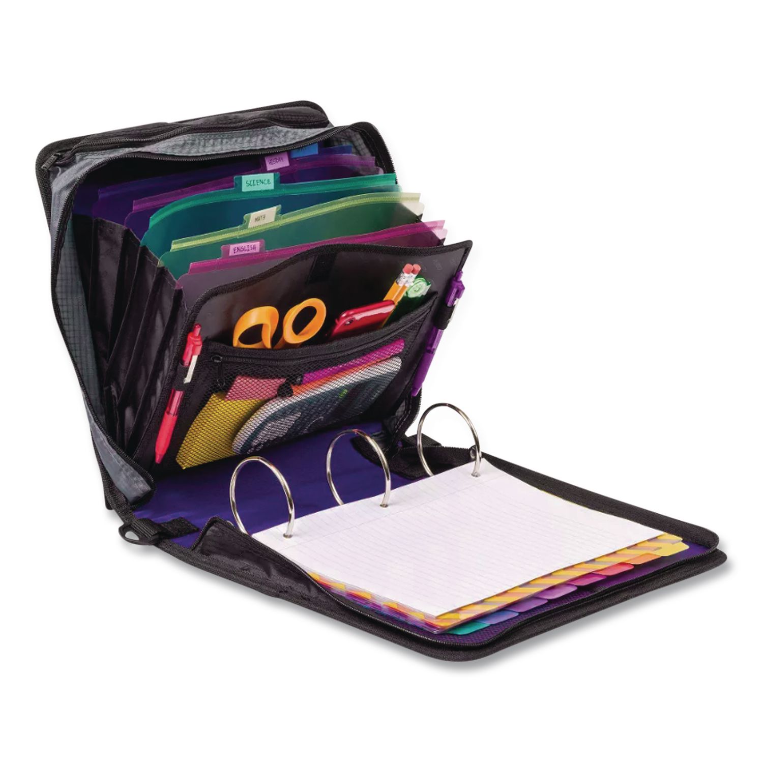 Premium large rings hold multiple subjects. Five tab, six pocket expanding file allows for storage up to six subjects. Handle and shoulder strap creates ease of mobility. Patented angled zipper keeps gusset out of the way when writing. Unique designed gusset is made of Rip-stop material that traps punctures to prevent tearing. Binder Type: Ring; Binder Style: Non-View; Binder Size Capacity: 3″; Binder Sheet Capacity: 480.
