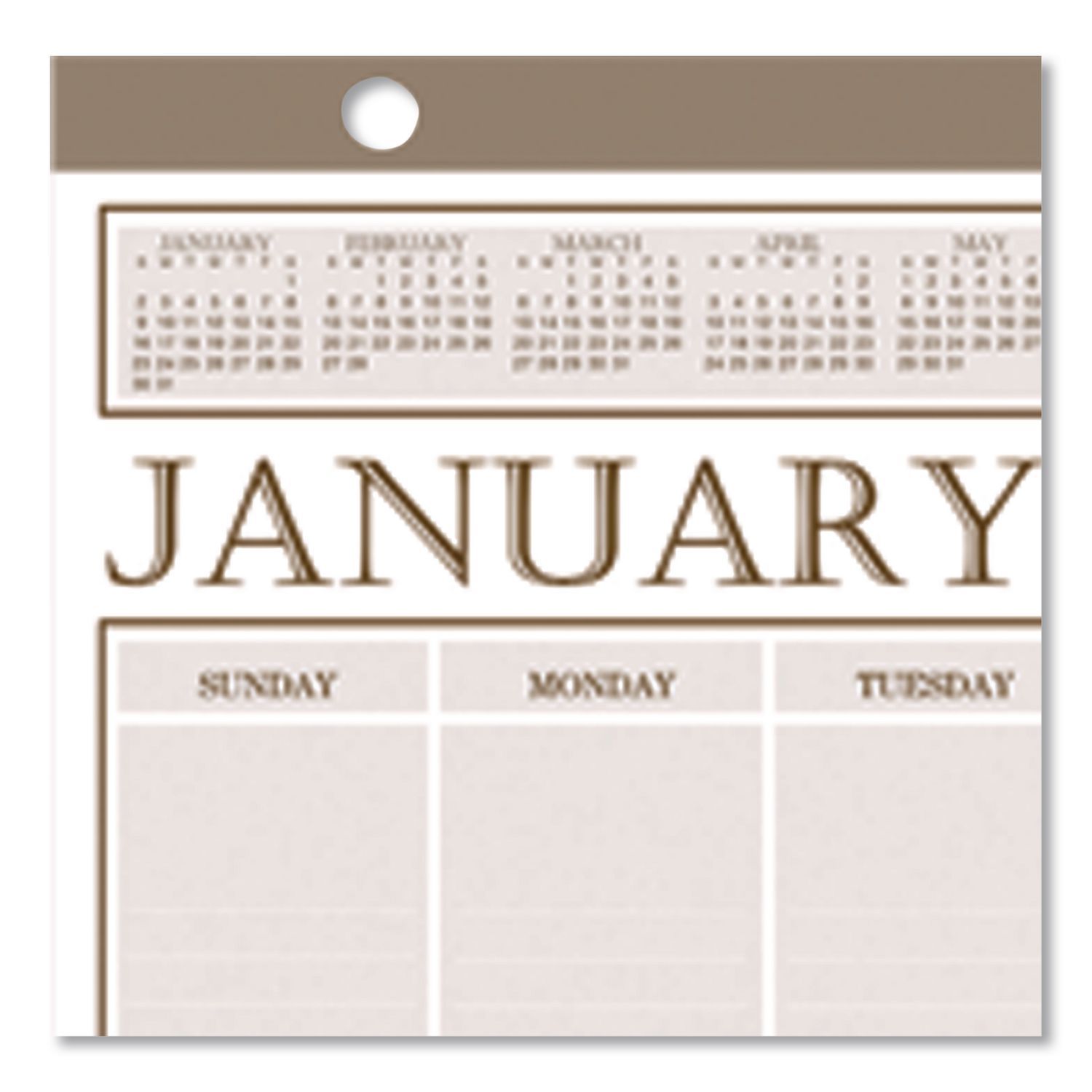 Wall calendar is printed in dark brown and beige colors for an elegant look. Lightly ruled, large daily blocks help keep notations neat. Brown, simulated-leather binding with a three punched holes provides rigidity and a classic look. Full, 12-month calendar for long-term planning. Each page is perforated at the top for easy tear-off as needed. Made entirely of recycled materials. Dated: Yes; Academic Year: No; Calendar Format: Monthly; Calendar Spread Format: One Month per Page.